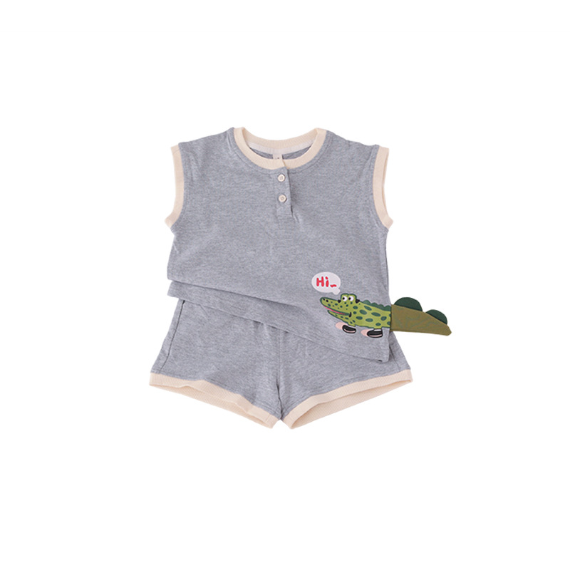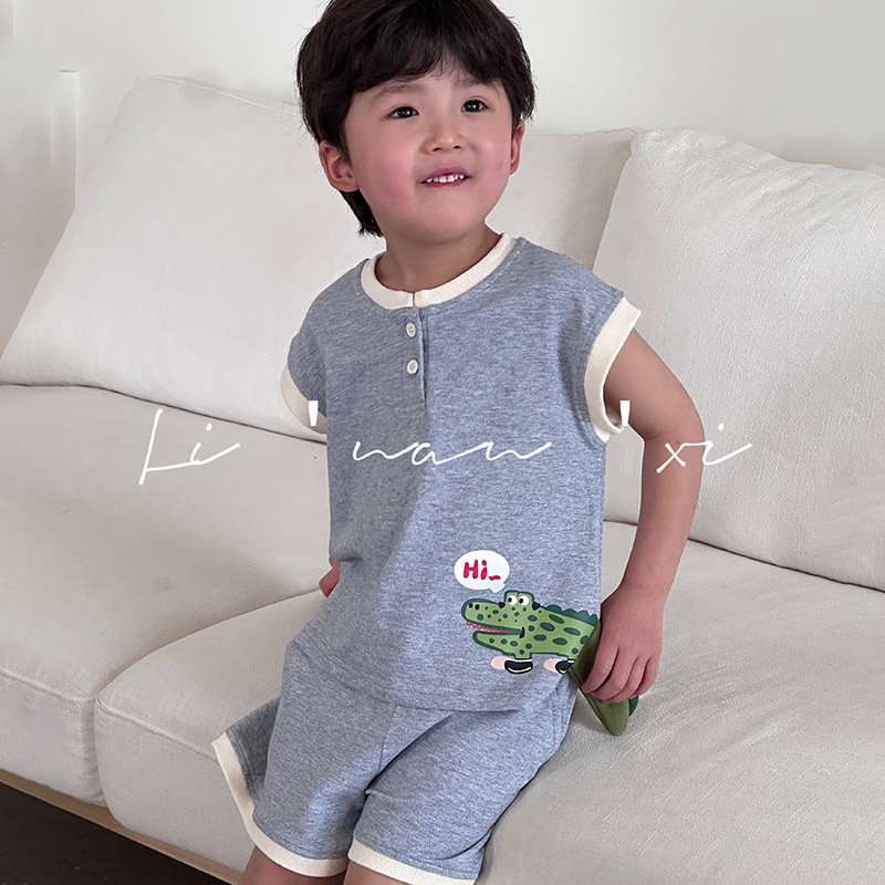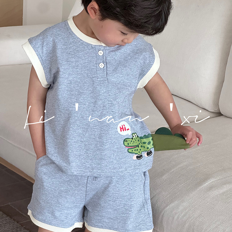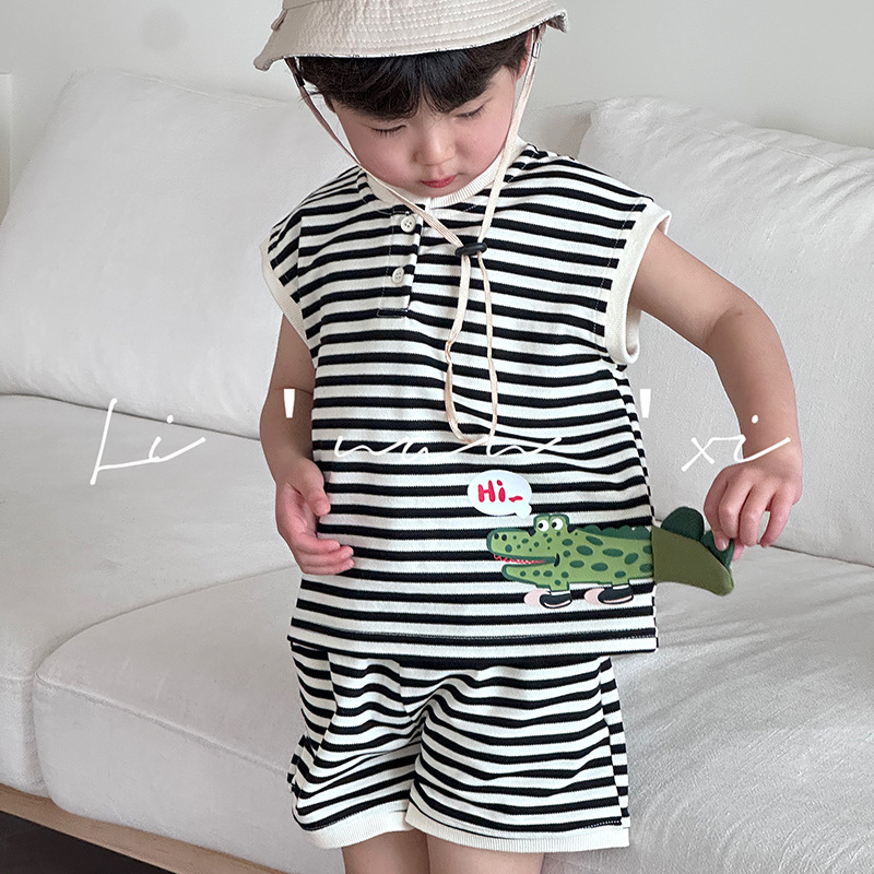 50012夏季新款24年儿童套装韩版童装条纹针织无袖卡通短裤两件套