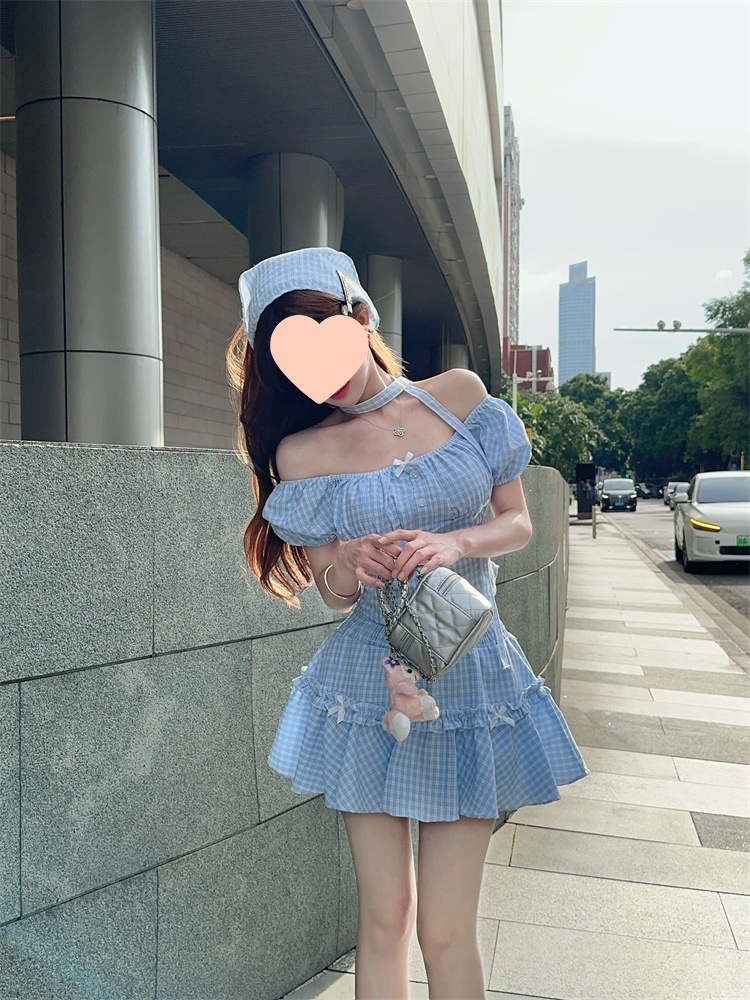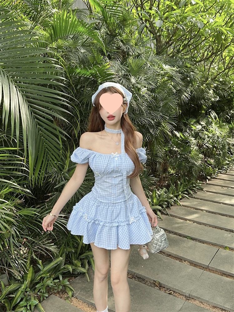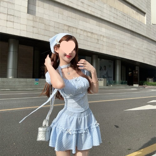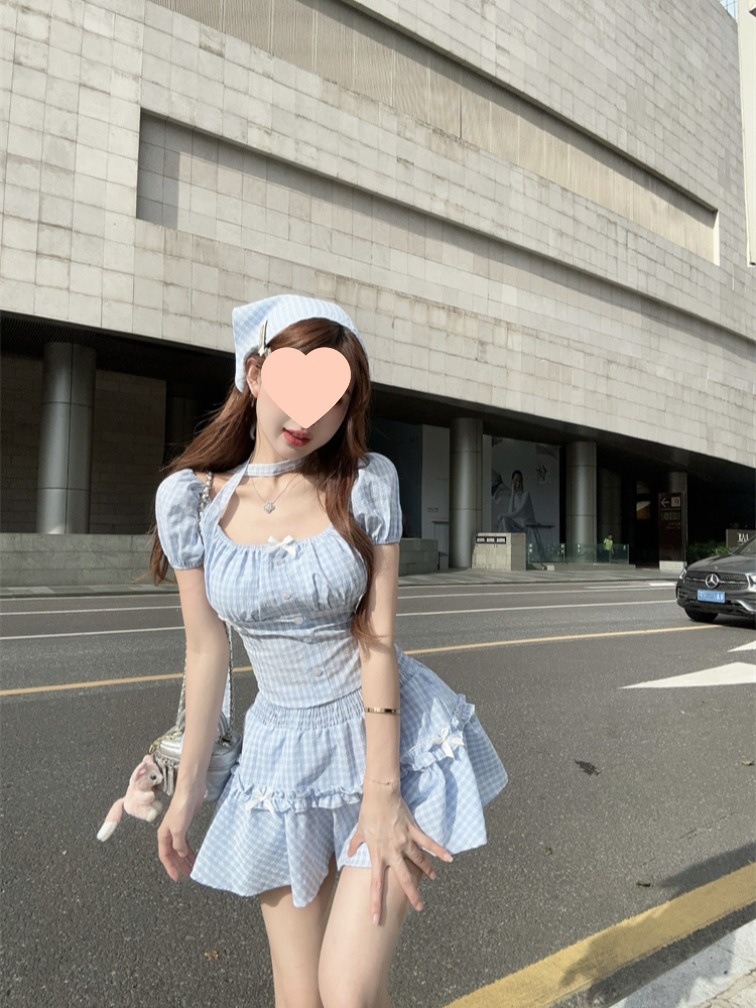 夏季蝴蝶结格子短款衬衫上衣可盐可甜头巾高腰半身裙四件套