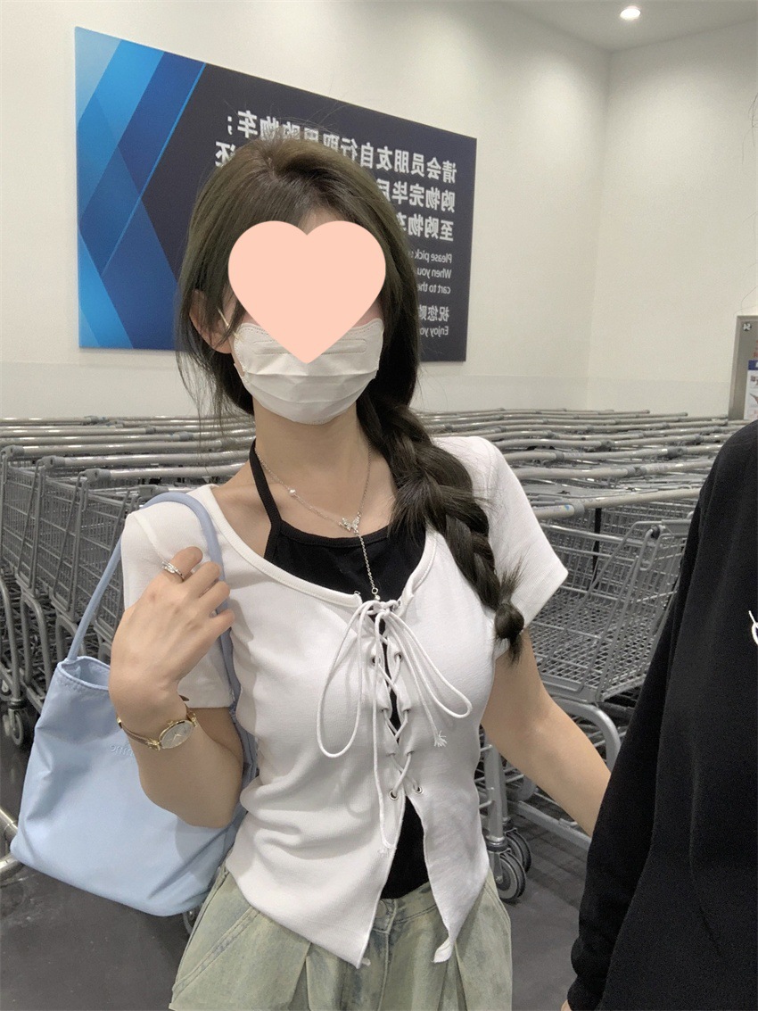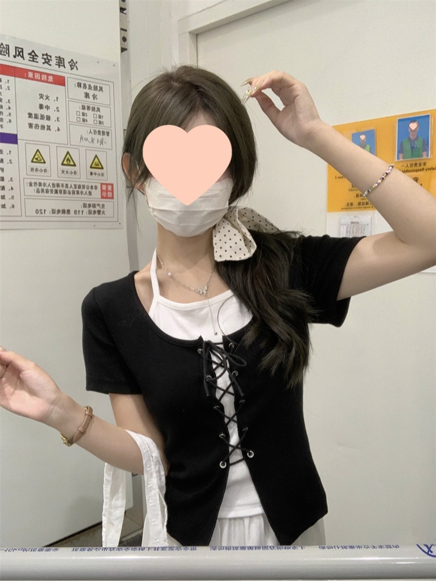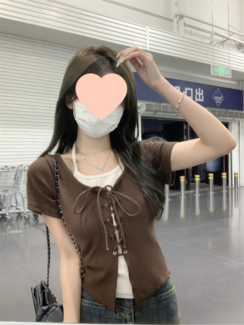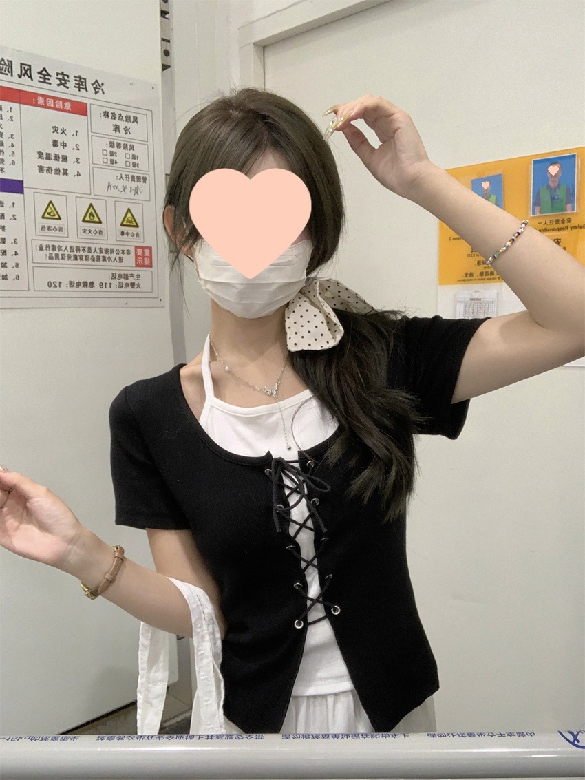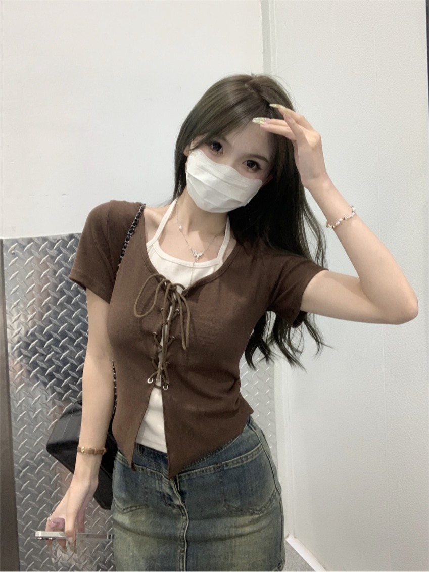 甜辣修身显瘦短款上衣夏季新款女装小众假两件拼接挂脖短袖T恤衫