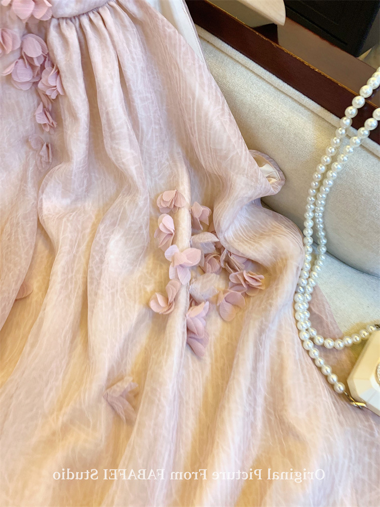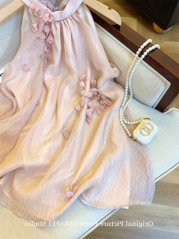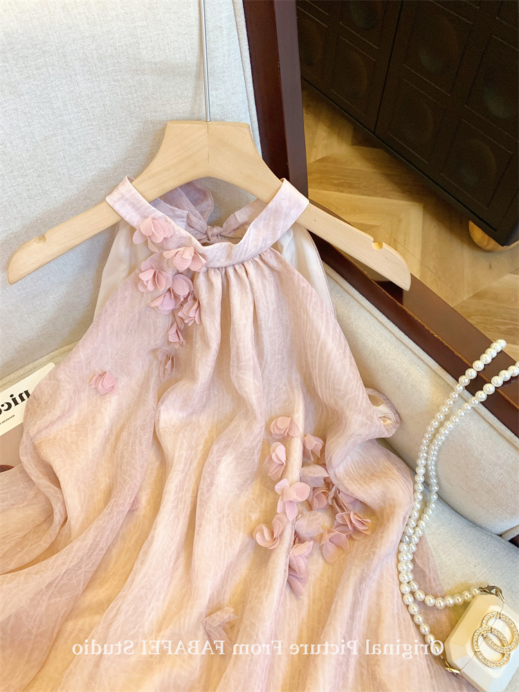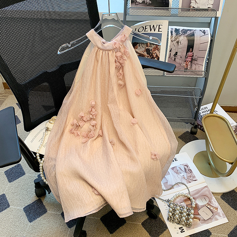 法式粉色立体花瓣挂脖衬衫女夏多巴胺女孩背心裙遮肚子雪纺小上衣