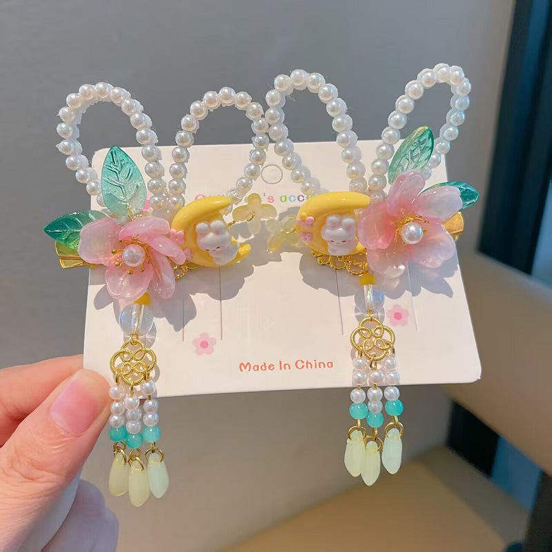 儿童古风发饰红色发夹流苏对夹中国风花朵汉服发夹小女孩中秋头饰