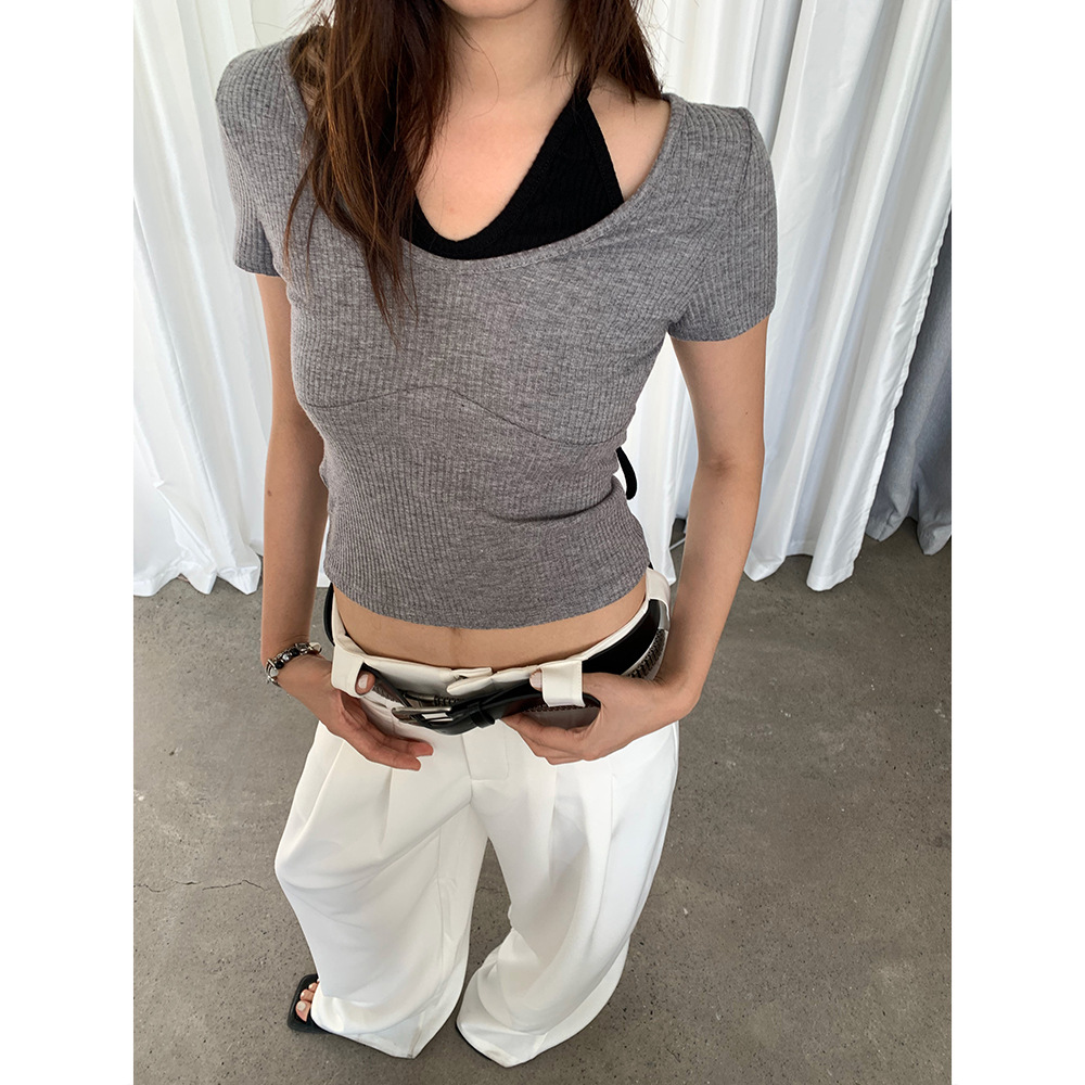 欧美木耳边系带短袖T恤女夏季辣妹修身短款上衣
