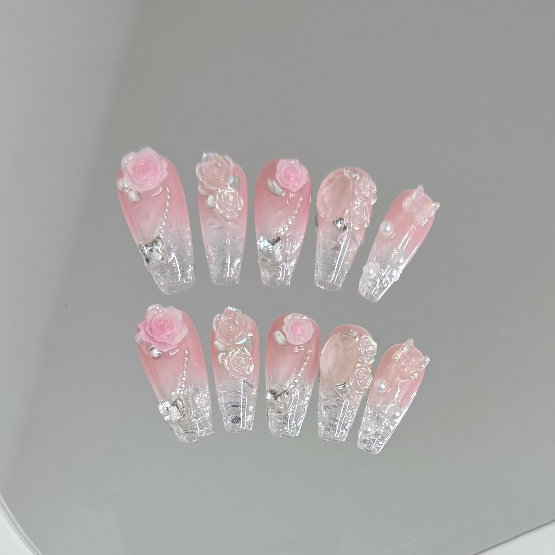 纯手工穿戴甲纯欲甜美风渐变冰透山茶花中长梯美甲温柔显白穿戴甲