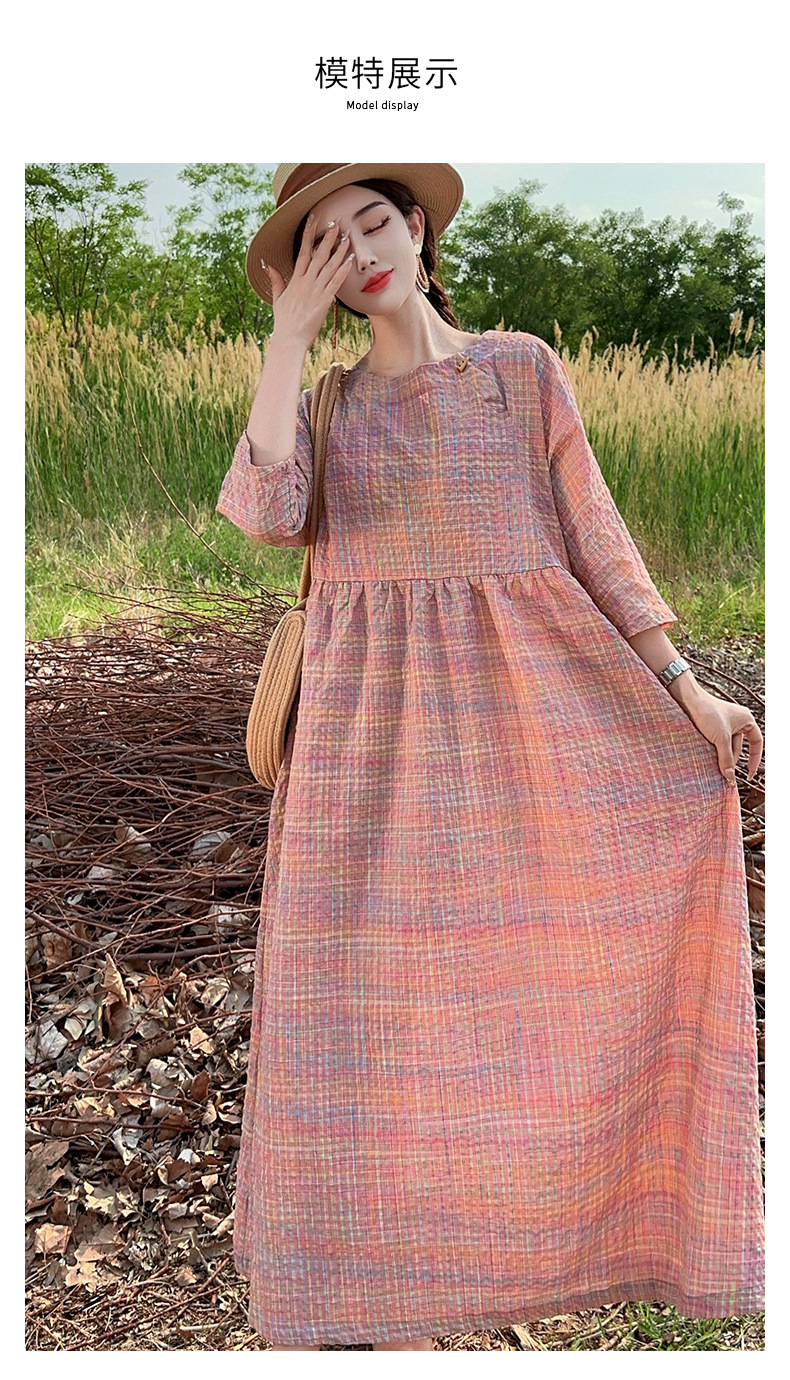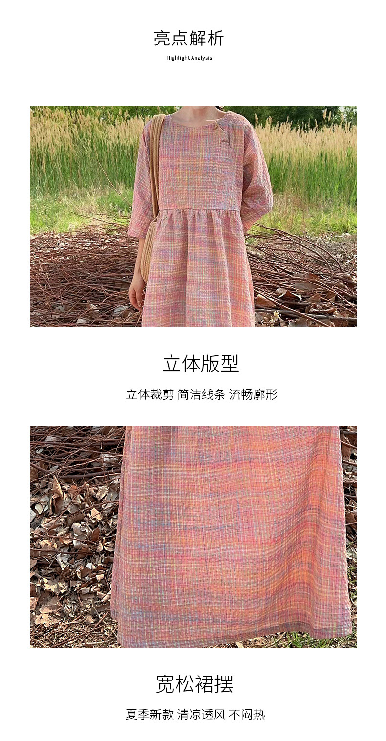新款文艺风连衣裙彩虹色粉色格子盐缩亚麻宽松色织大摆裙中长款裙
