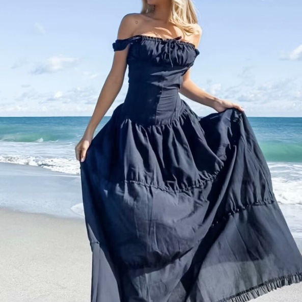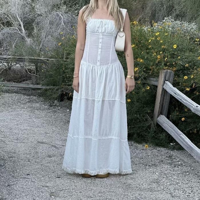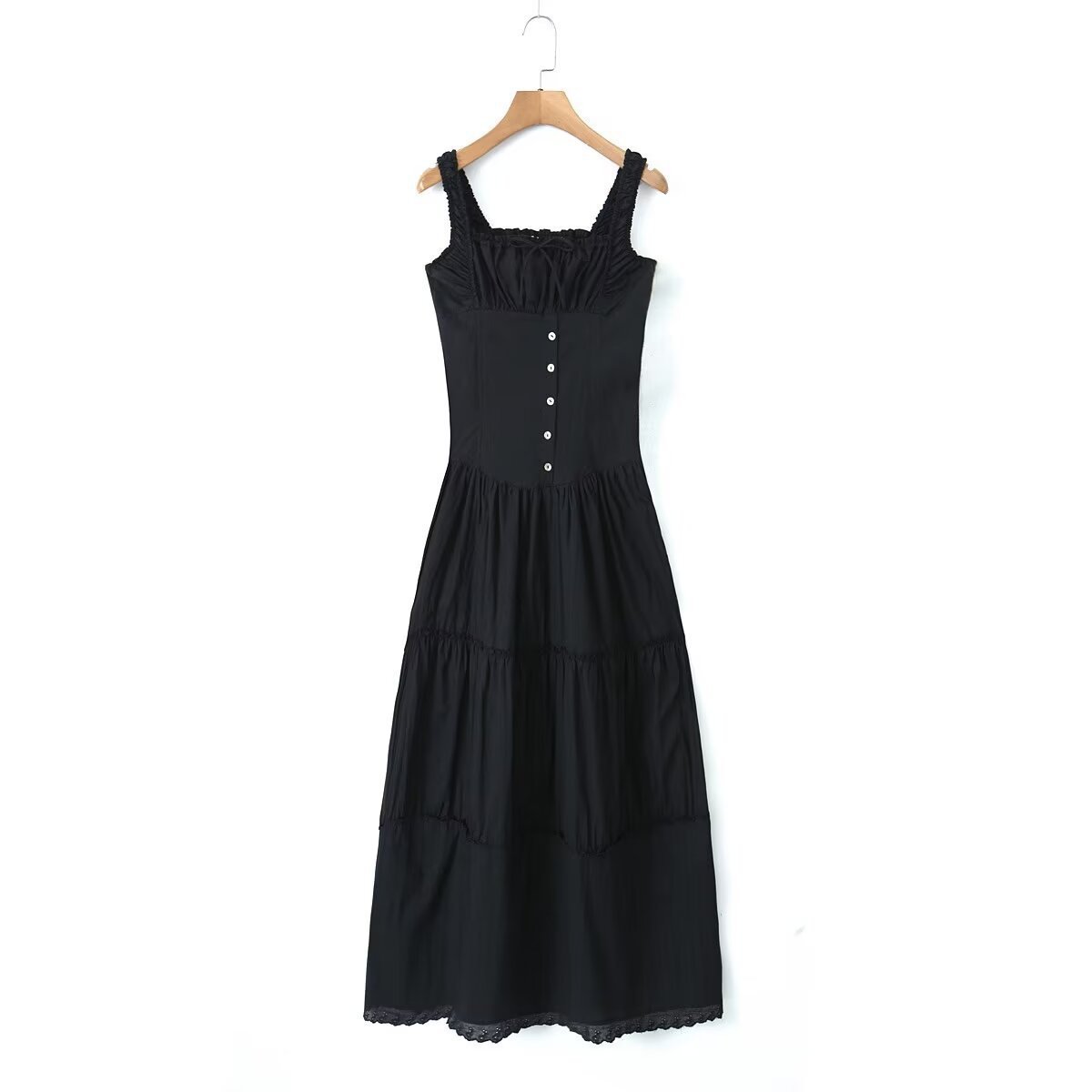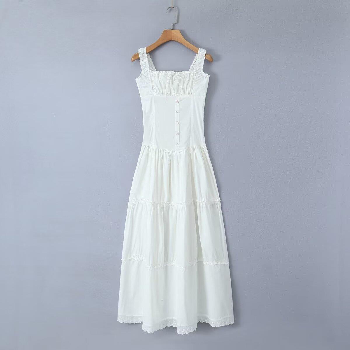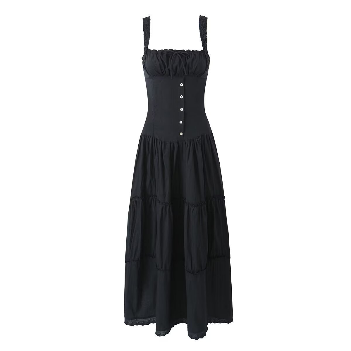 法式复古方领褶皱收腰胸前系带连衣裙女少女修身拼接木耳边长裙夏