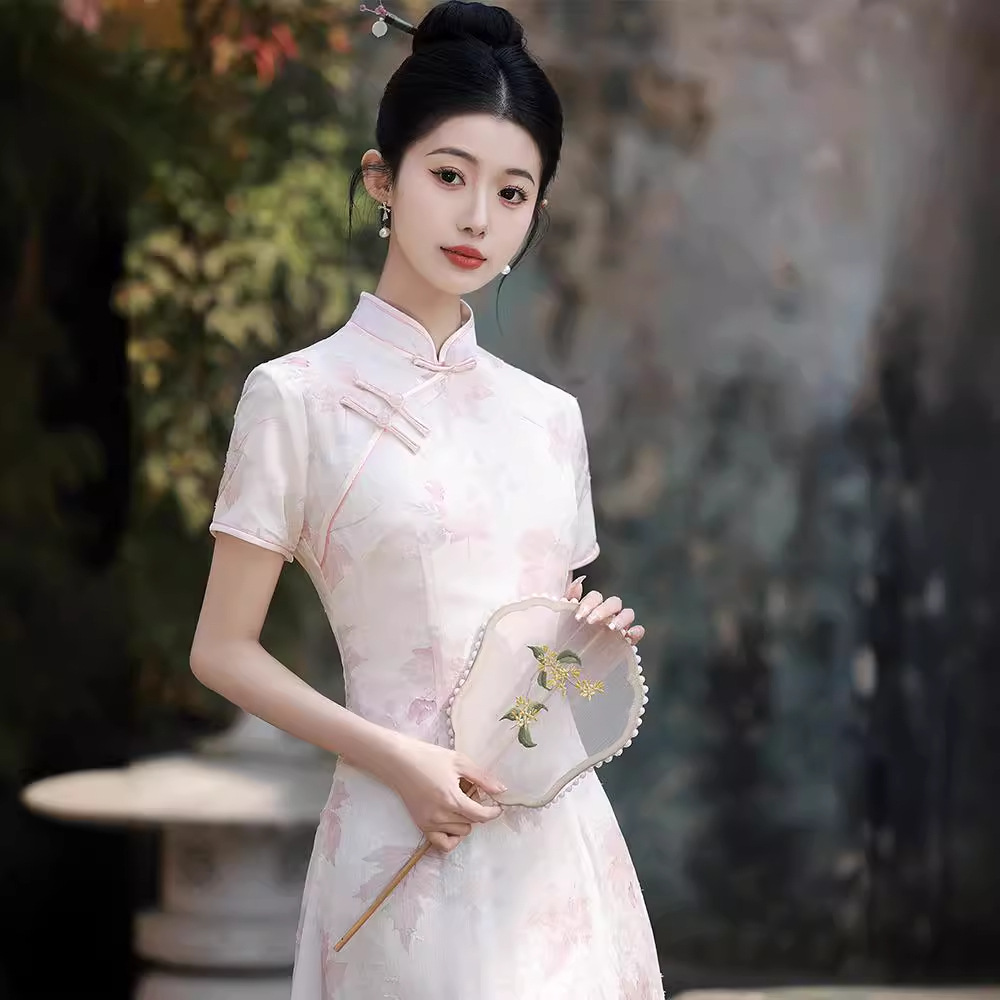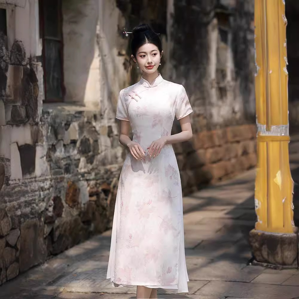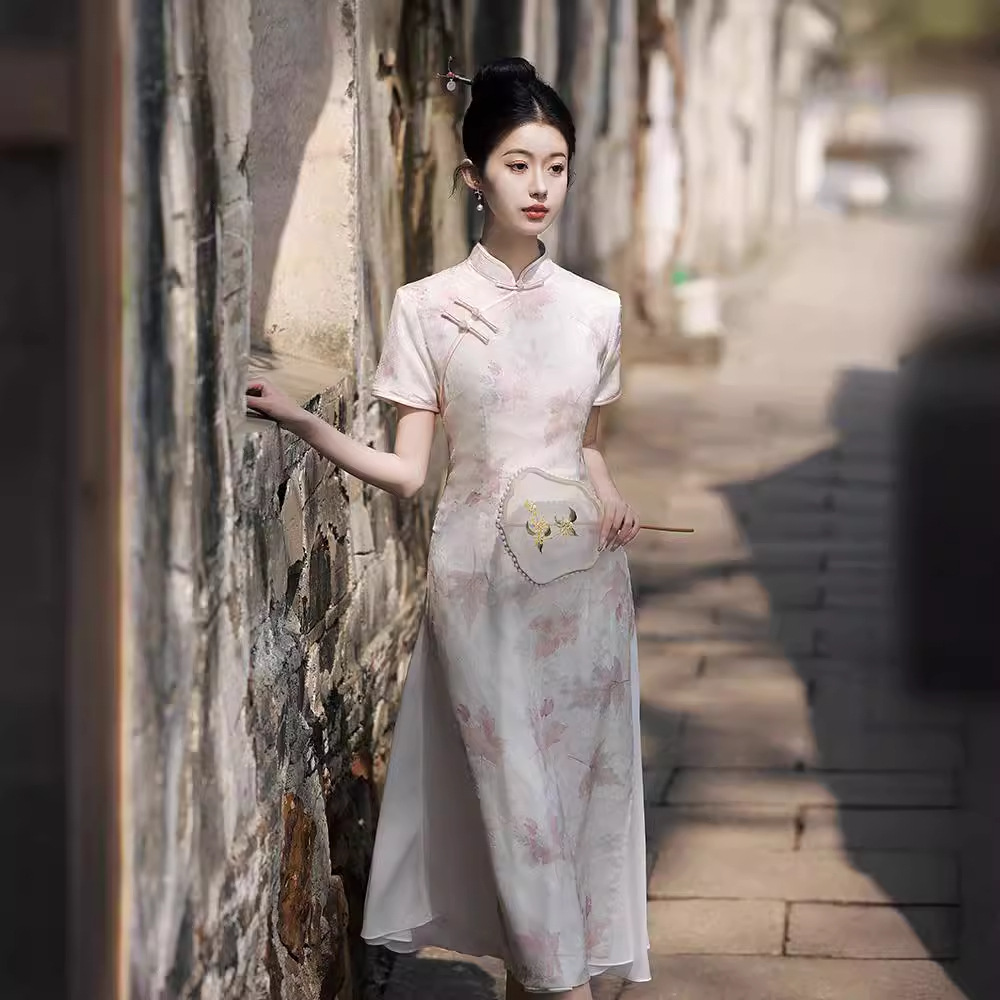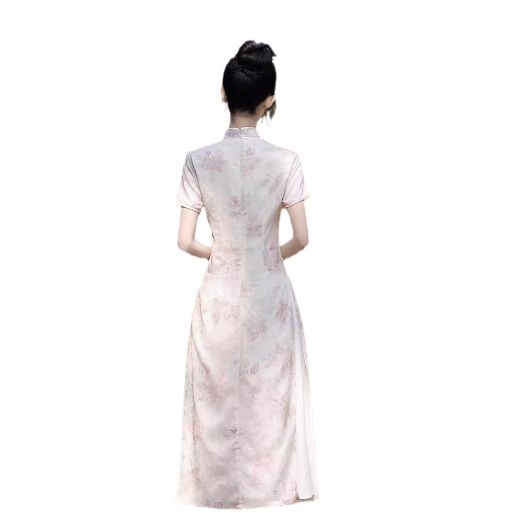 新款旗袍改良年轻款粉色小个子日常素雅遮肚子微胖复古中式连衣裙