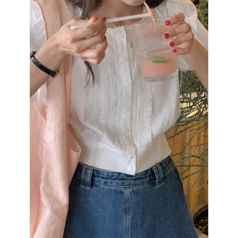 自制 奶乖韩妹 白色短袖衬衫女夏季小众设计感气质泡泡袖衬衣