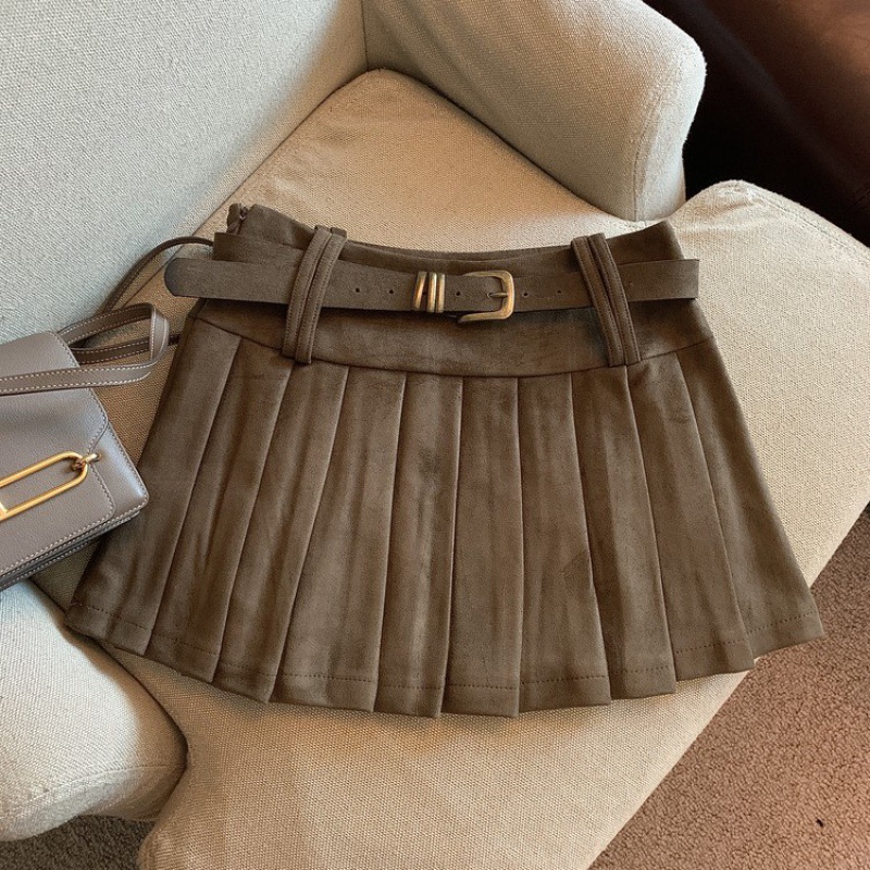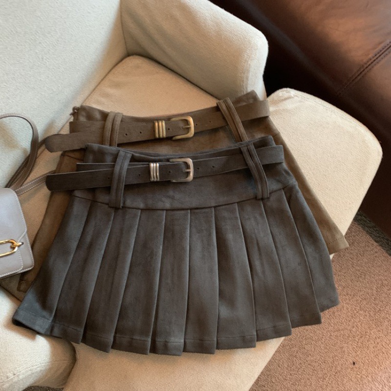 辣妹风美拉德咖色麂皮百褶裙女春高腰半身短裙a字裙子