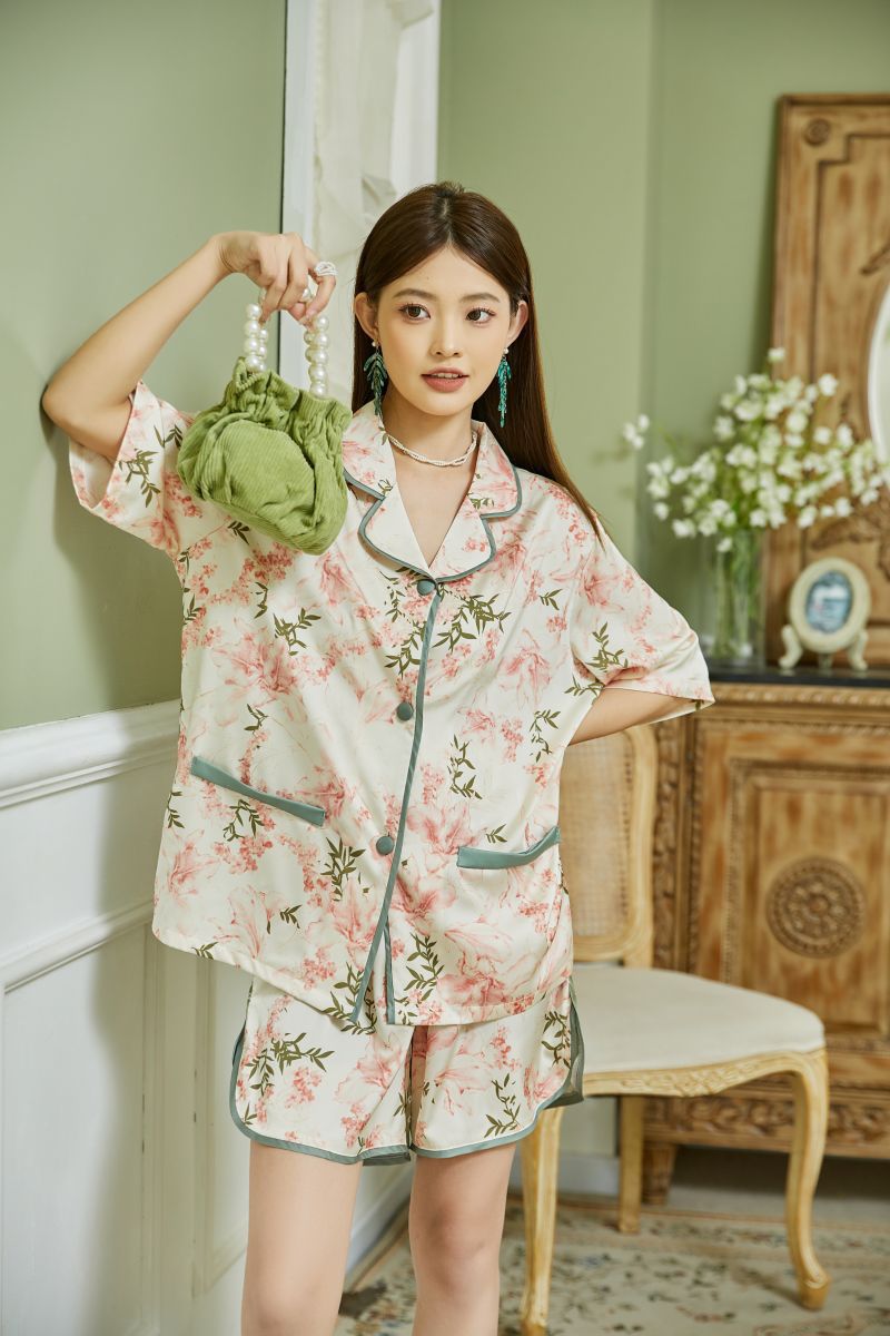 复古花卉冰丝睡衣女夏季薄款短袖短裤两件套装家居服可出门外穿