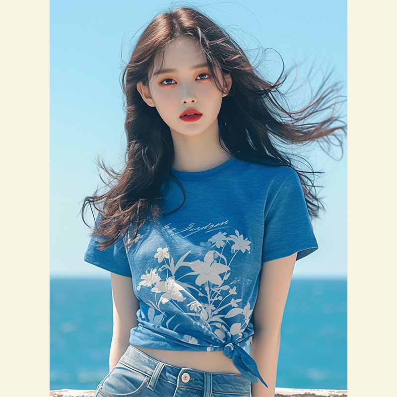 夏季新款别致绝美甜辣小上衣独特超好看蓝色印花短袖T恤女