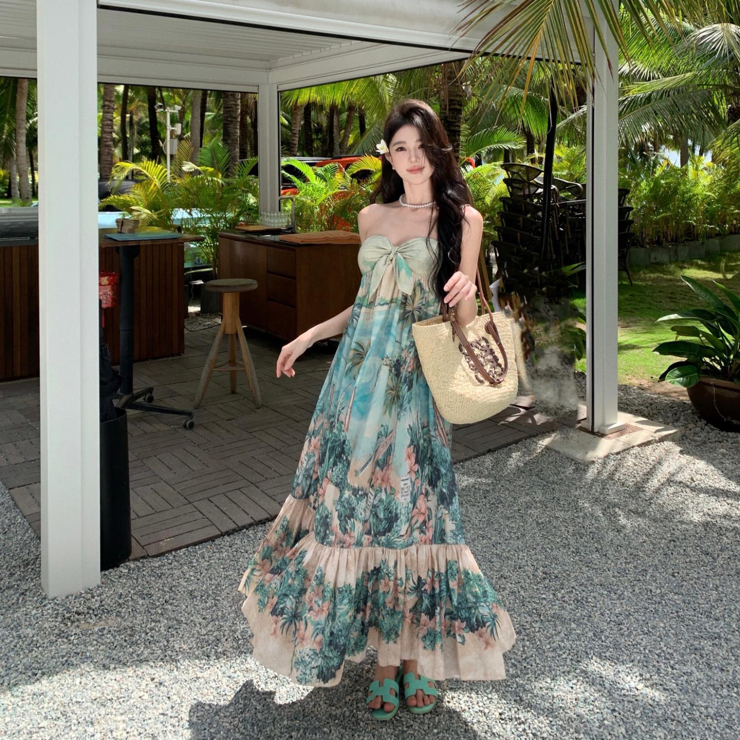 一字肩抹胸连衣裙女春季海边度假长裙性感气质纯欲露肩裙子