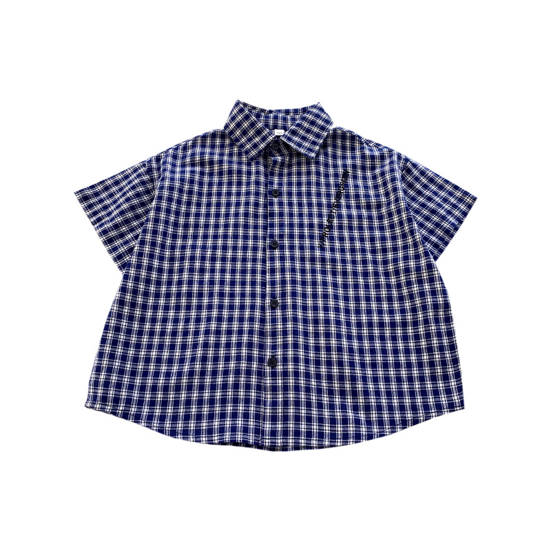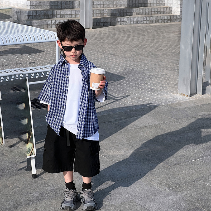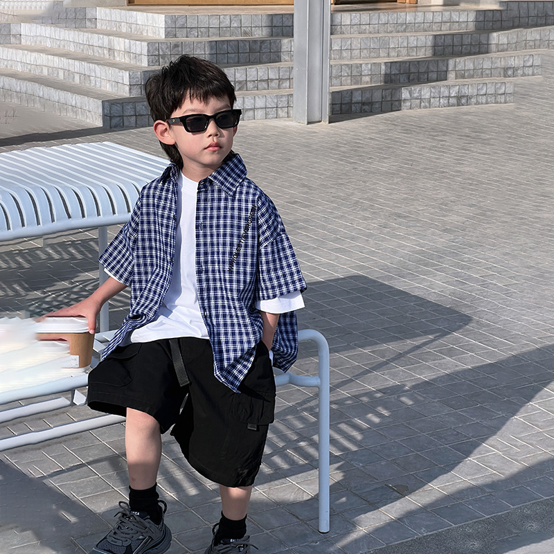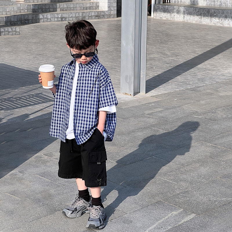 儿童夏装男童短袖衬衫新款格子衬衣男孩透气上衣夏季薄款外套