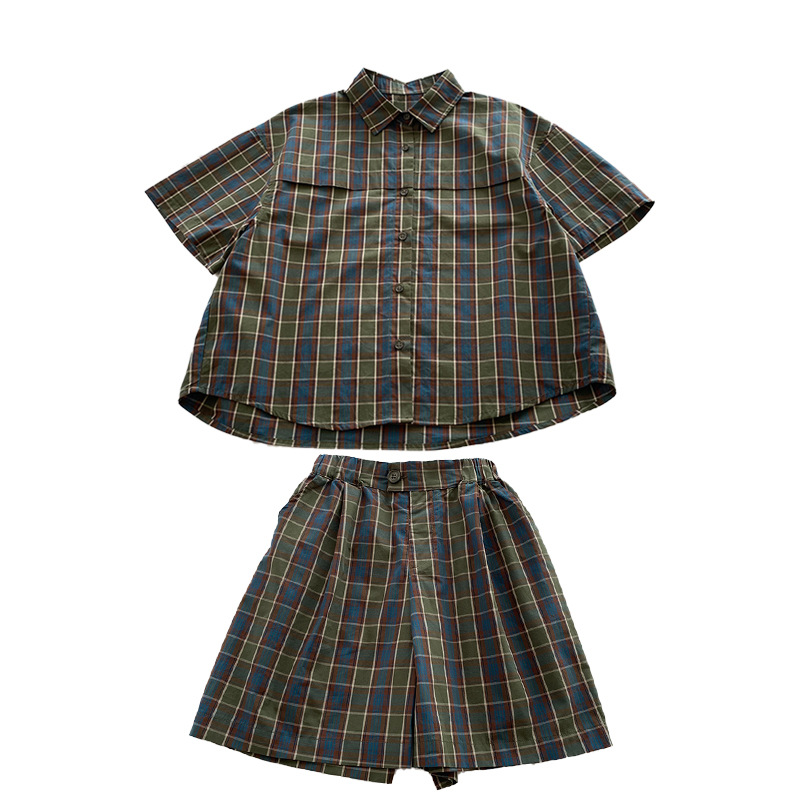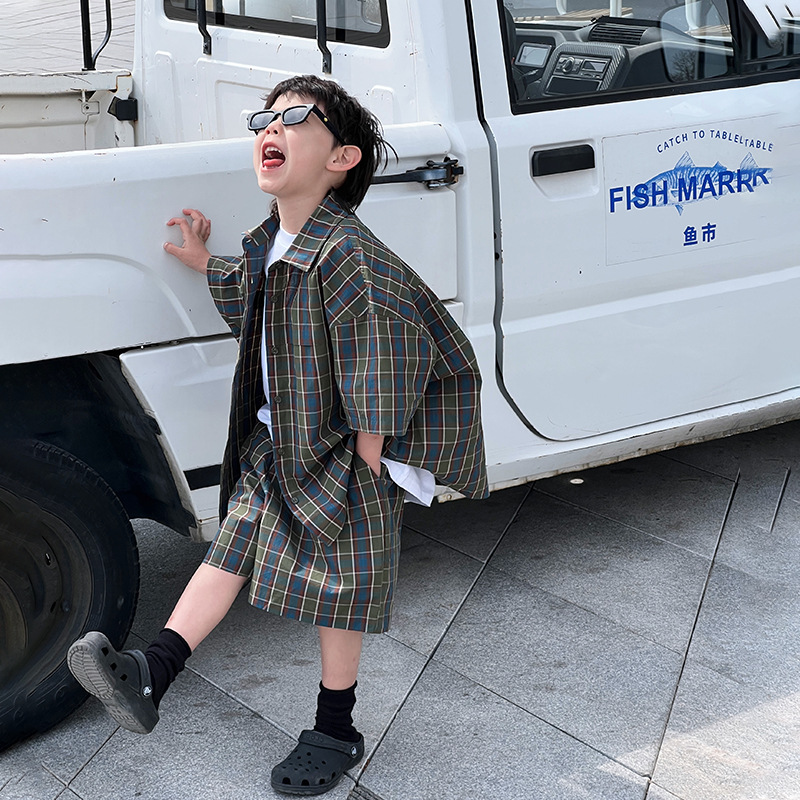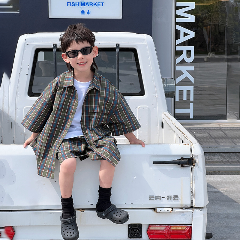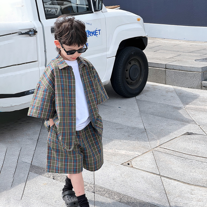 儿童夏装男童衬衫套装小男孩格子衬衣休闲两件套夏季新款衣服