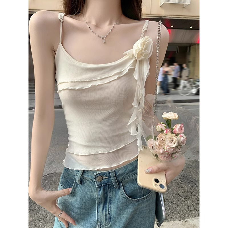 法式纯欲网纱微透薄款可调节飘带小吊带甜辣妹外穿背心女夏季上衣