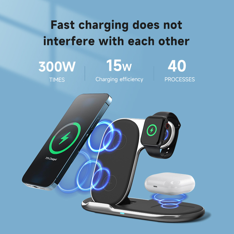适用于苹果15手机无线充电器三合一可折叠耳机iwatch桌面支架快充