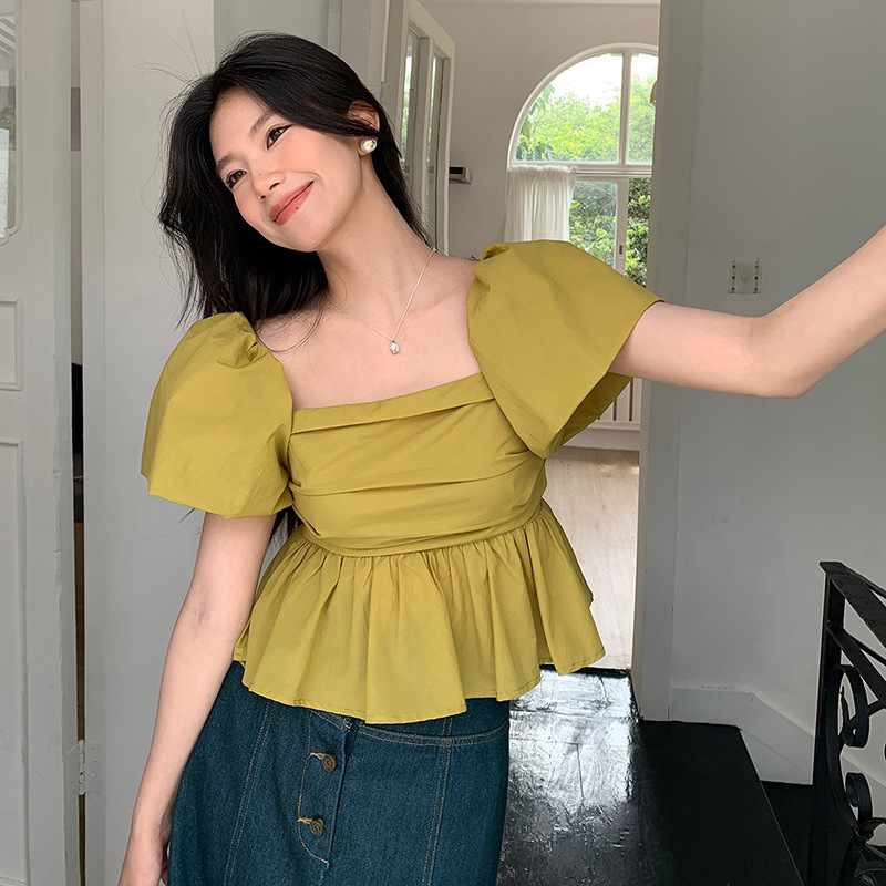 诠释美 NEW OPEN夏衬衫女法式甜美设计小众高腰方领上衣82520