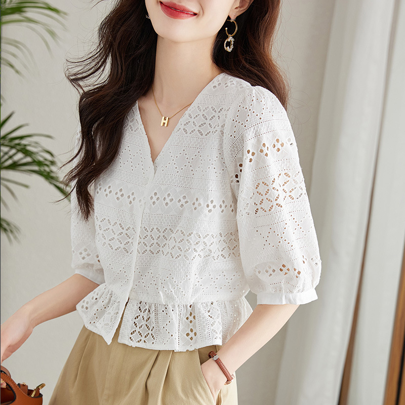 绣花镂空白衬衫女五分袖夏季新款小个子短款上衣纯棉v领衬衣
