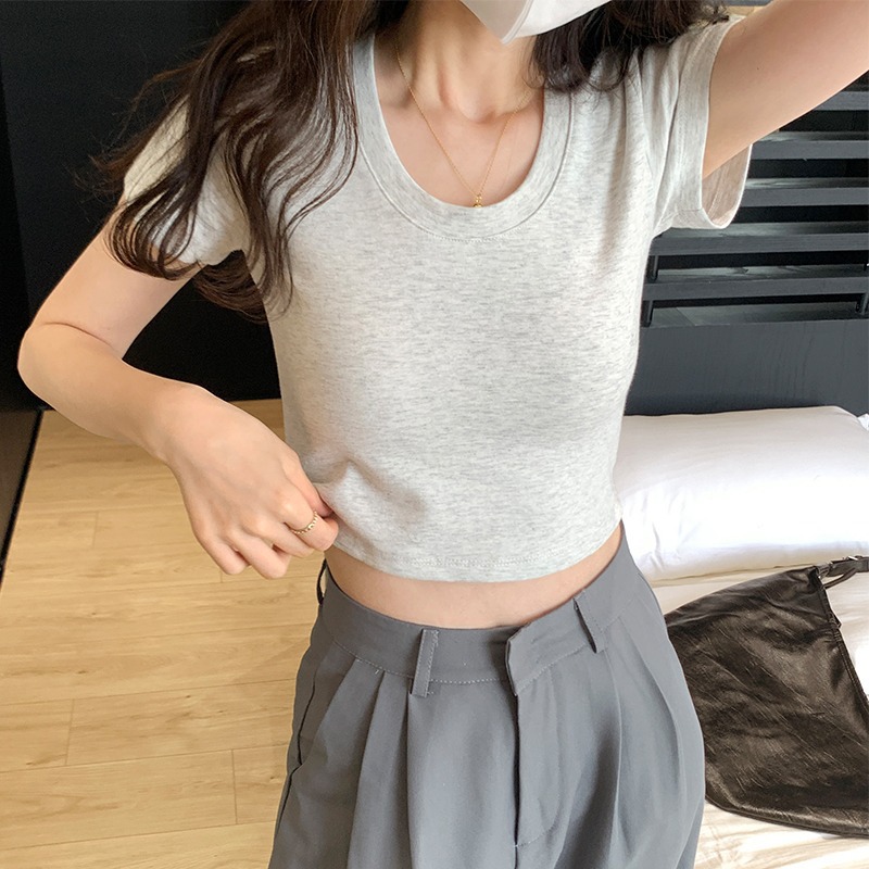正肩短袖短款T恤女新款夏修身辣妹露脐高腰显高显瘦上衣体恤