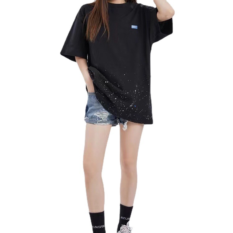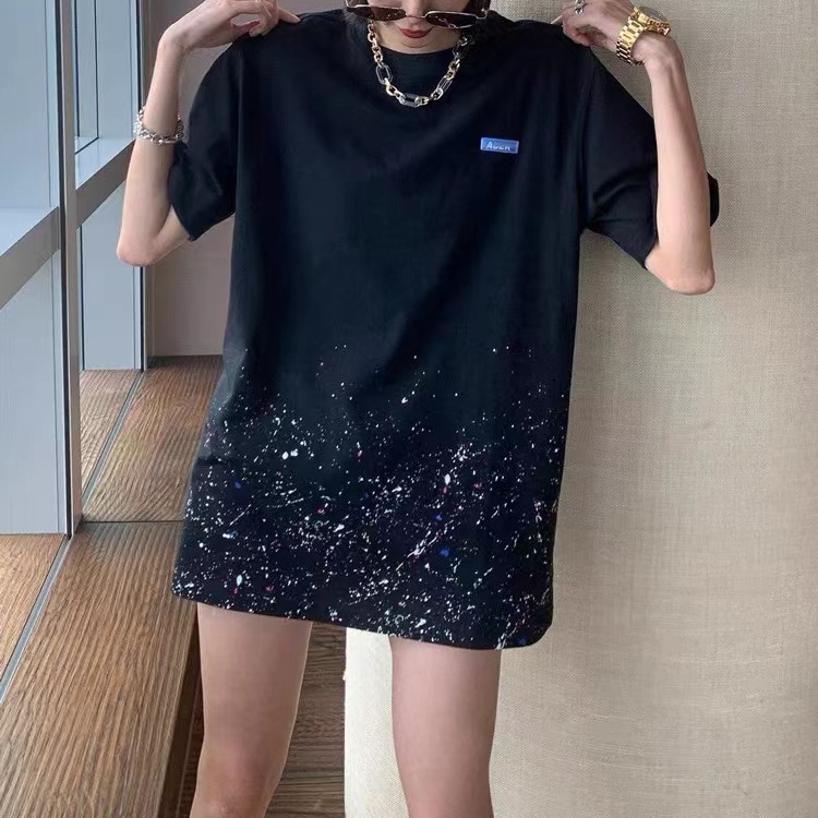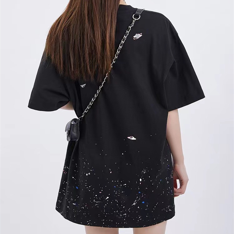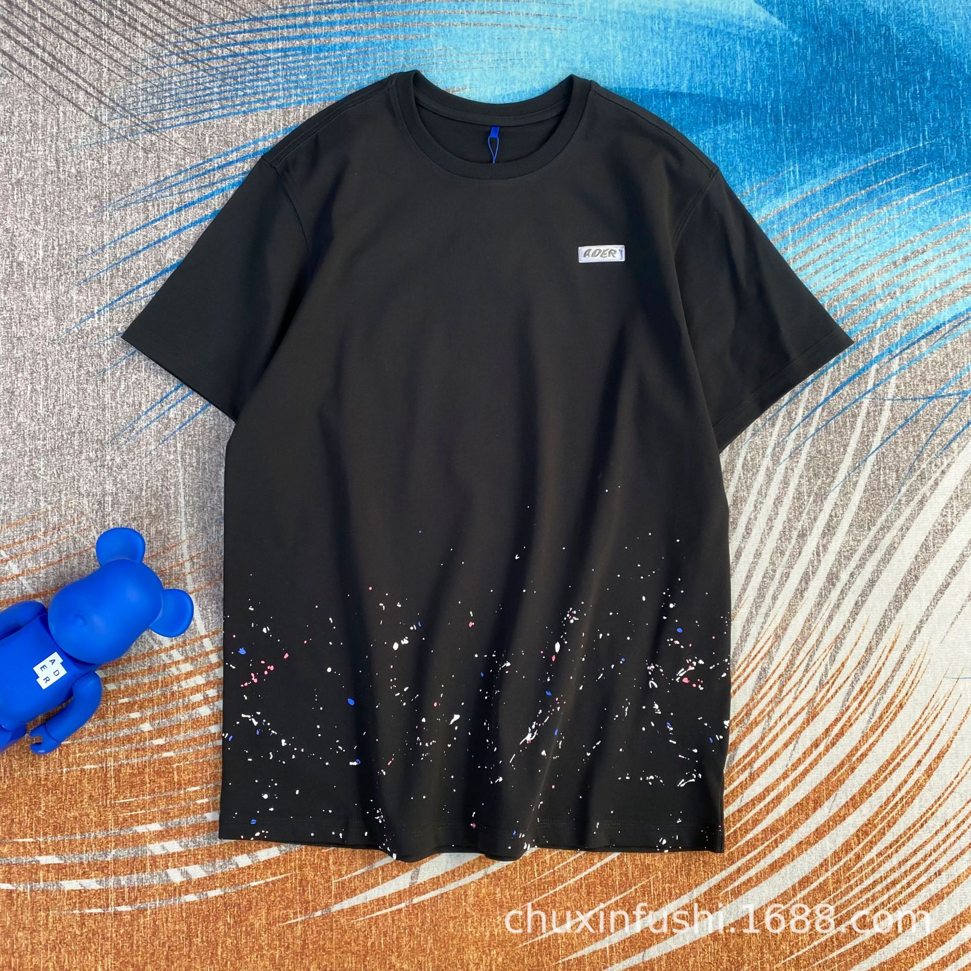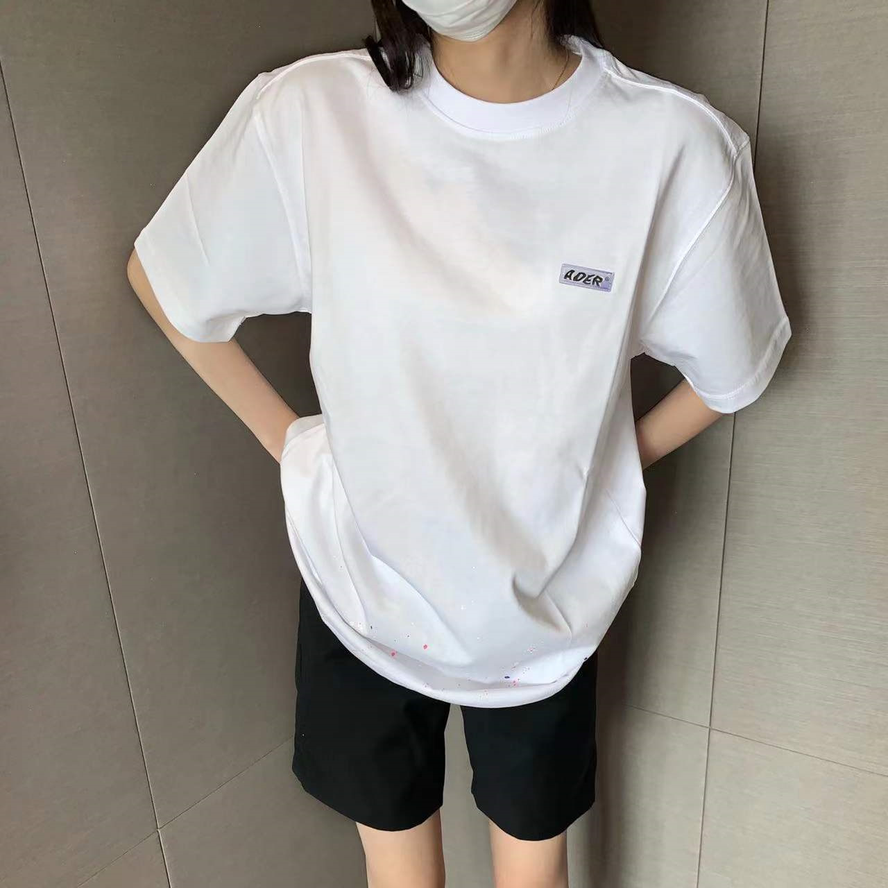 潮牌ADER泼墨小飞碟3D字母贴布宽松情侣T恤男女同款黑白圆领短袖