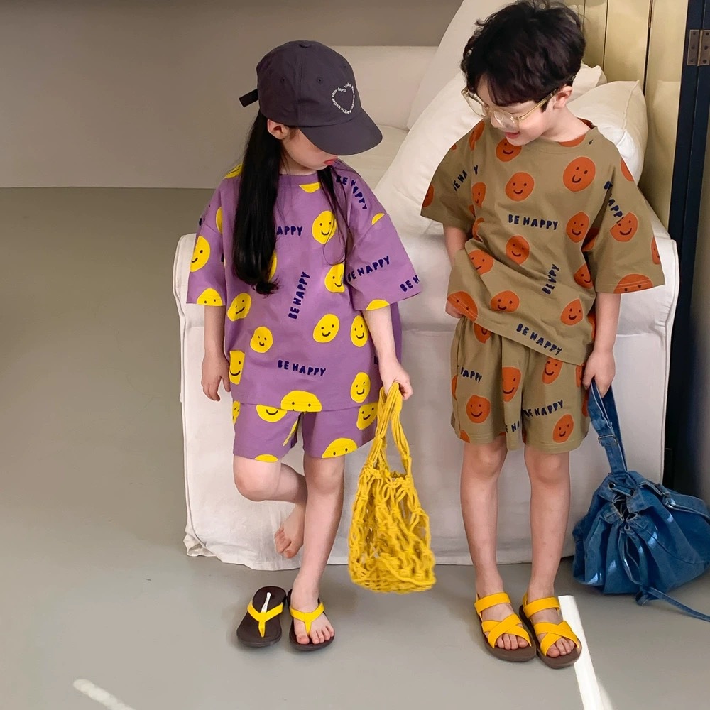 韩版儿童休闲套装夏款洋气短袖短裤男女宝宝卡通笑脸两件套运动薄
