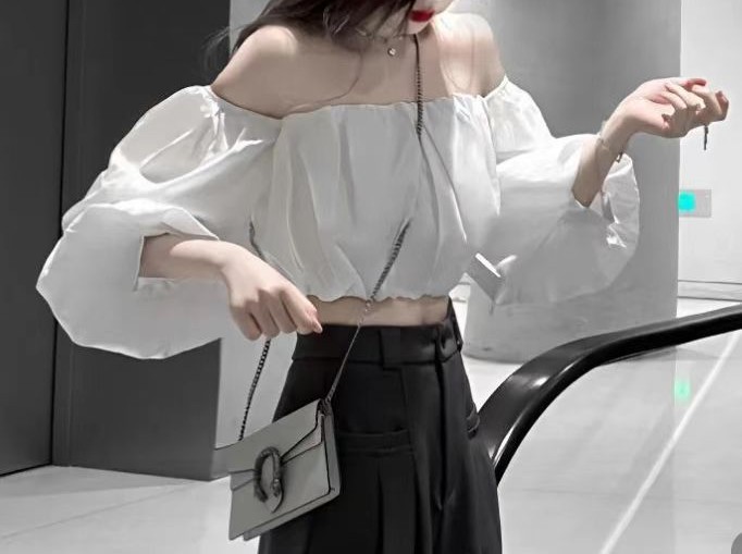 一字肩泡泡袖露肩鱼骨短款t恤女夏季雪纺衫辣妹薄款抹胸上衣服ins