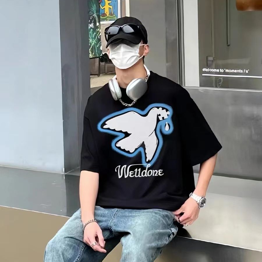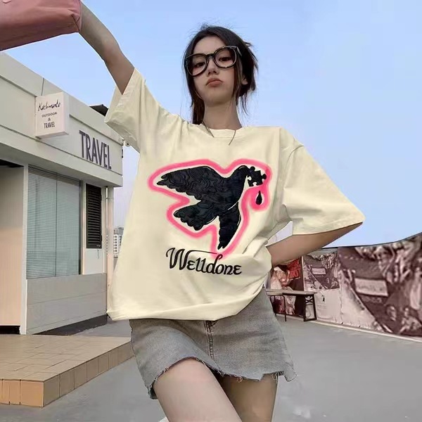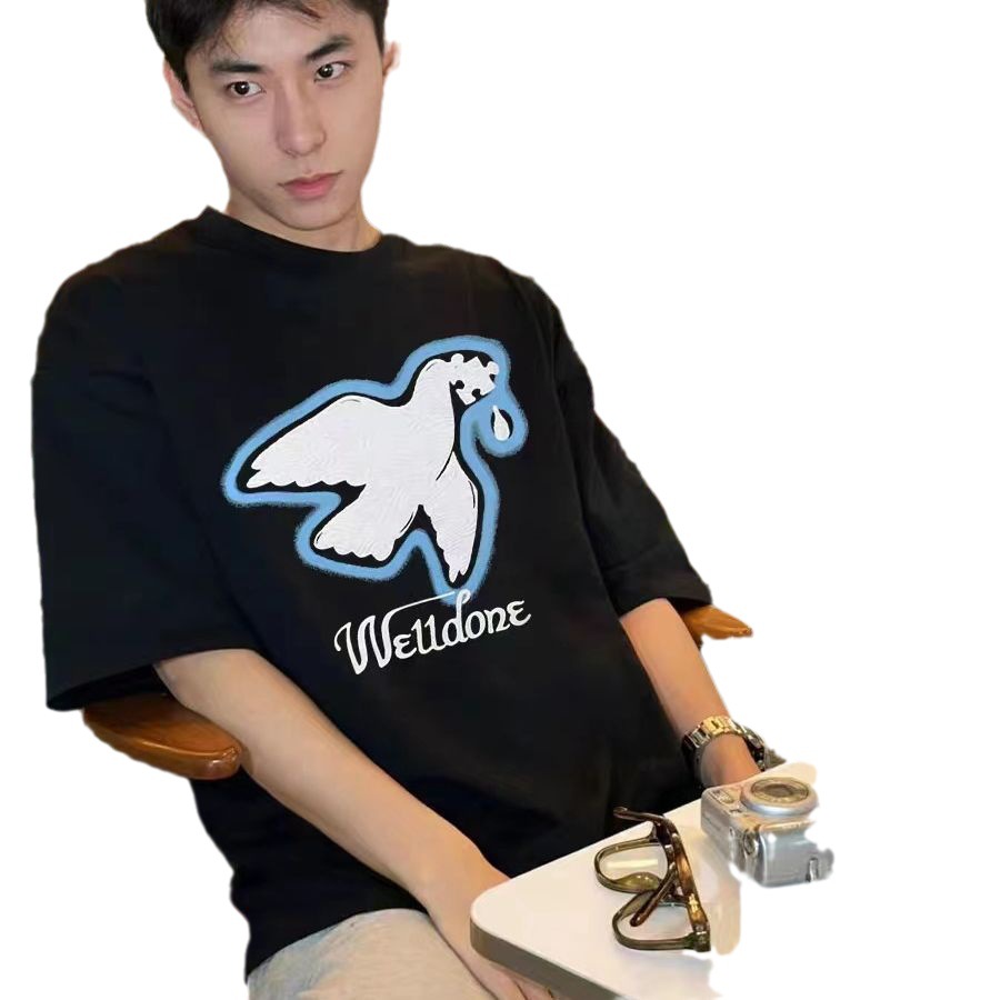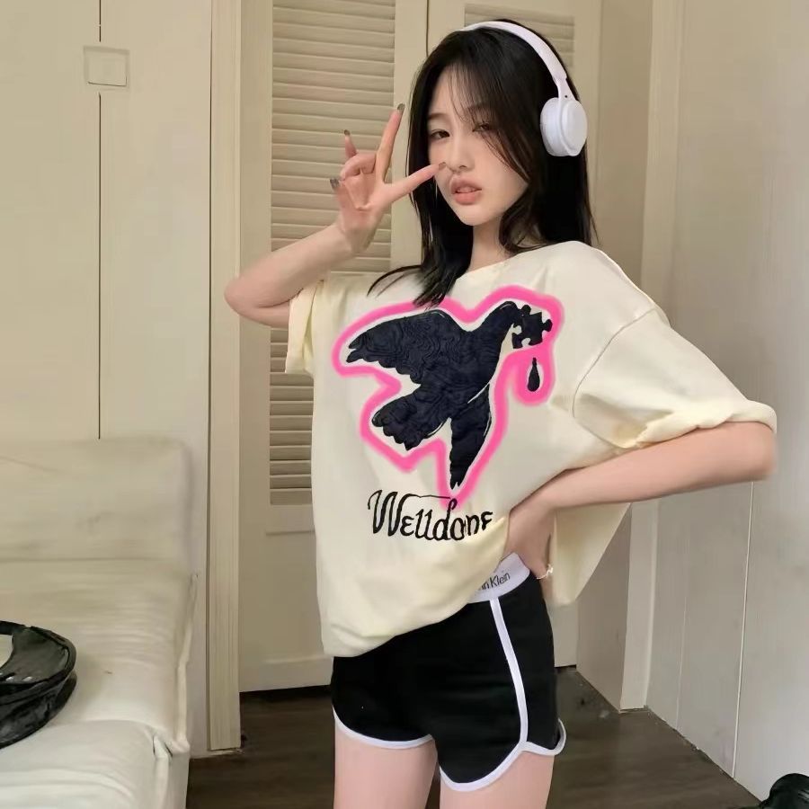 LANBOS WE11小众潮牌夏季新款鸽子图案T恤落肩短袖男女情侣款