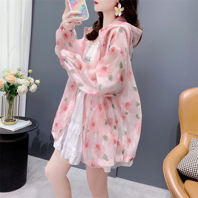 跨境防晒衣女拉链开衫夏季2025慵懒风印花设计连帽防晒长袖外套女