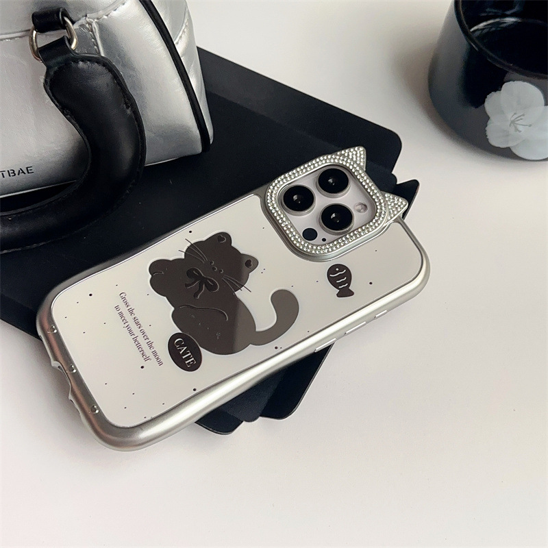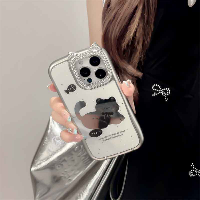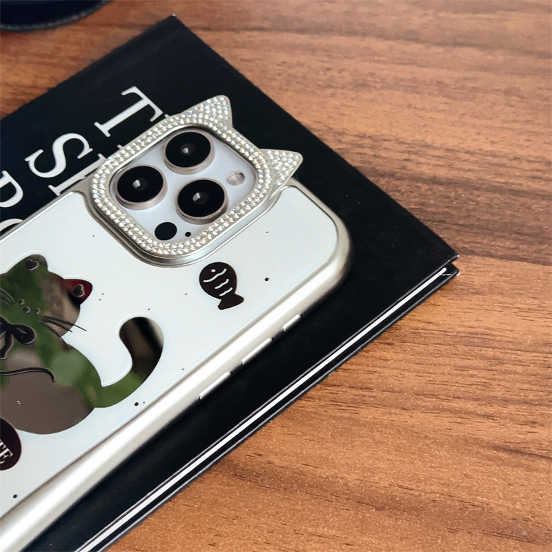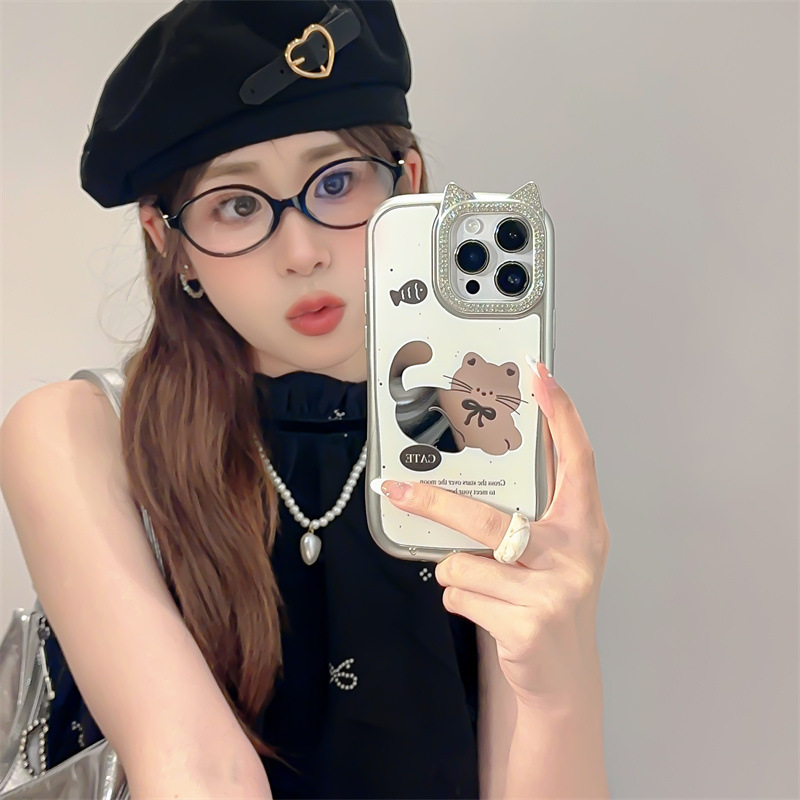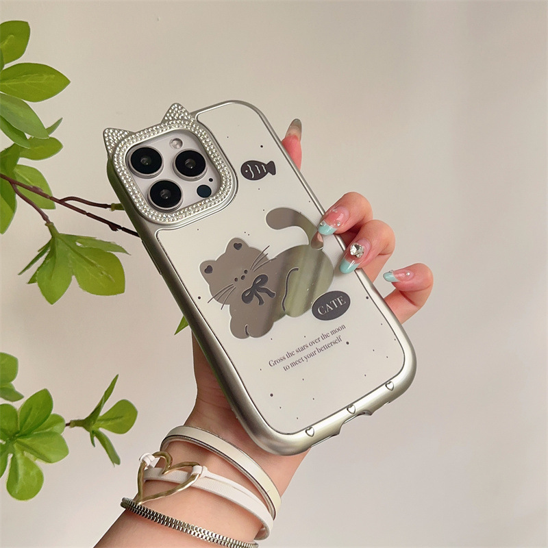 适用苹果15手机壳iPhone14promax镜面猫咪13pro卡通镶钻耳朵12/11