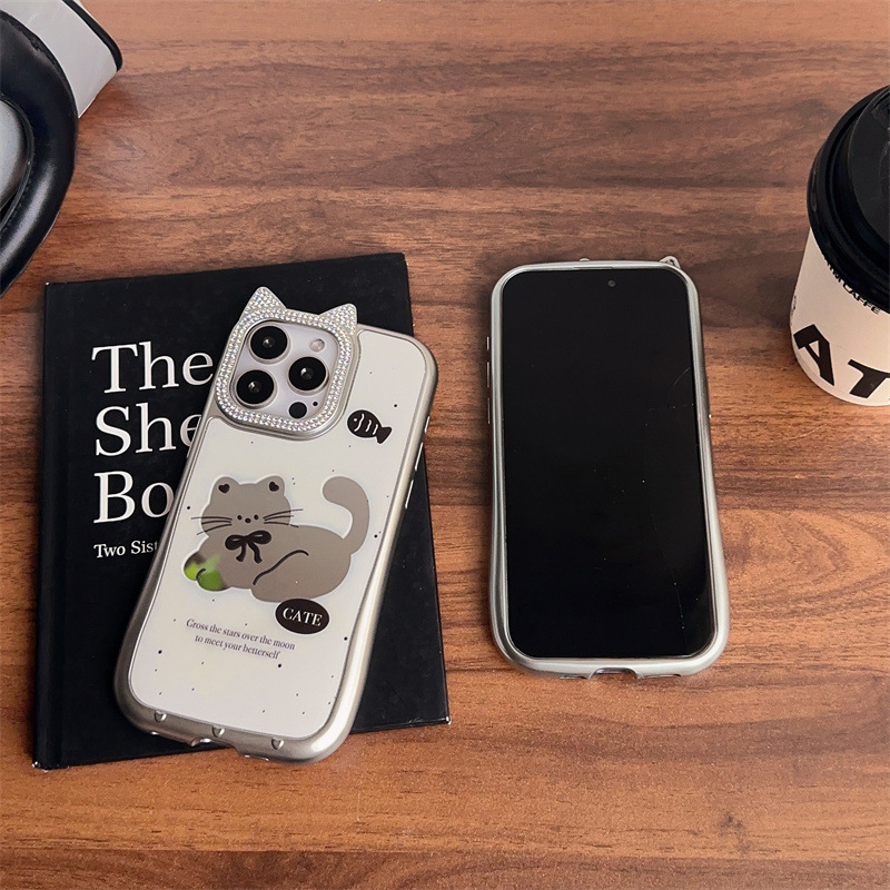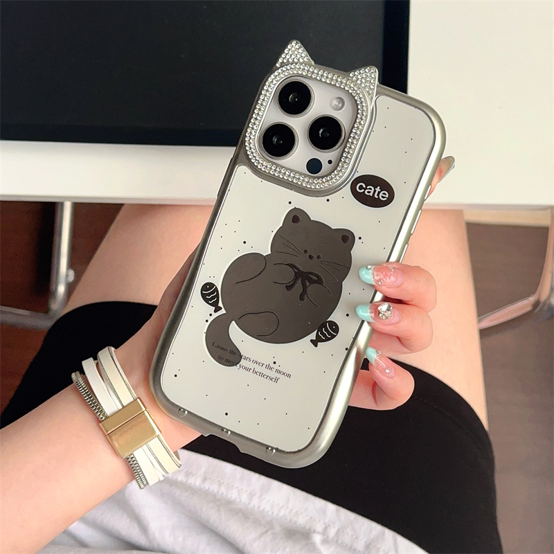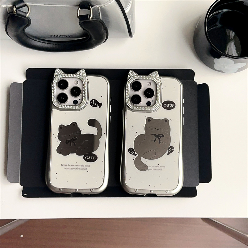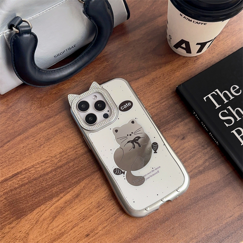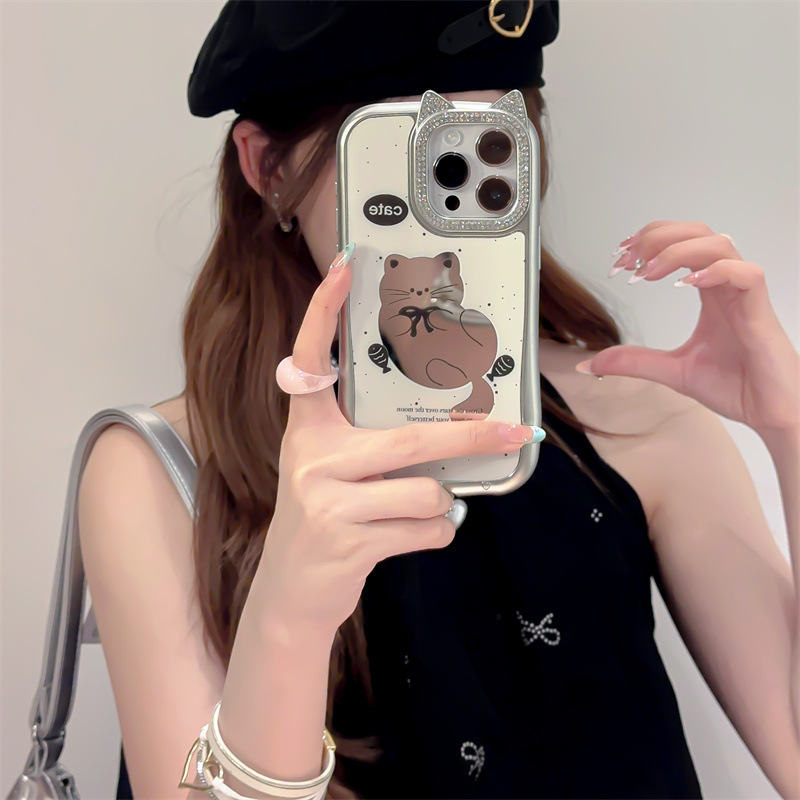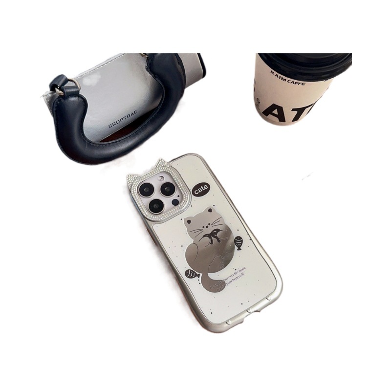 适用苹果15手机壳iPhone14promax镜面猫咪13pro卡通镶钻耳朵12/11