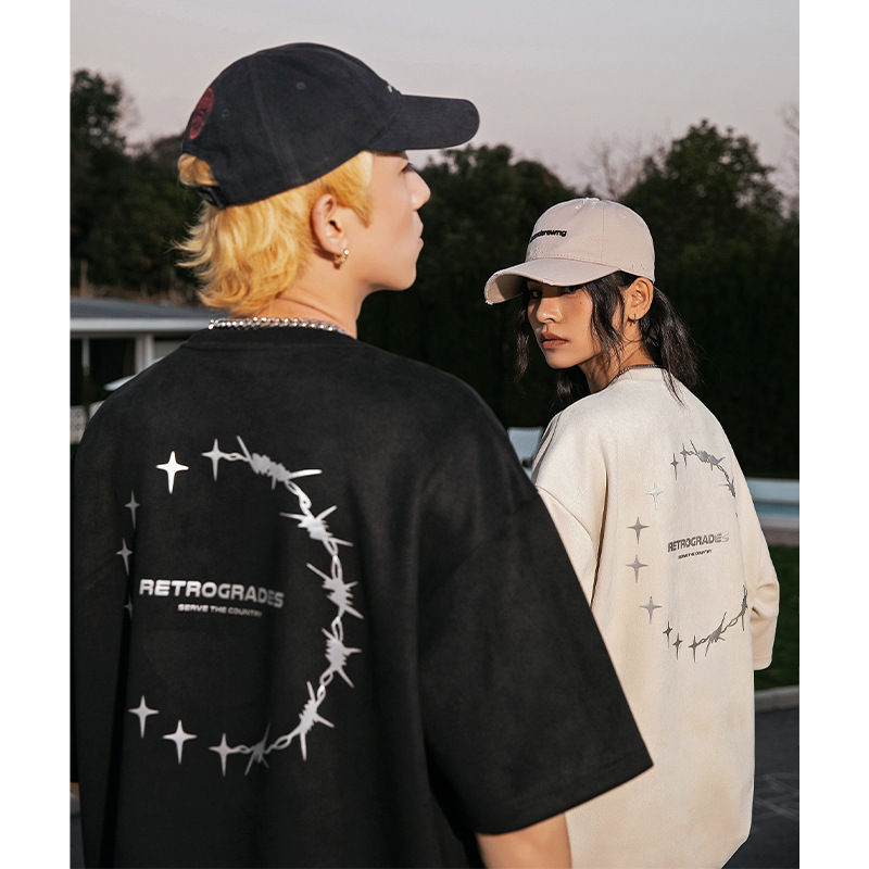 国潮麂皮绒复古美式T恤男女情侣装同款夏季高街潮牌印花短袖体恤