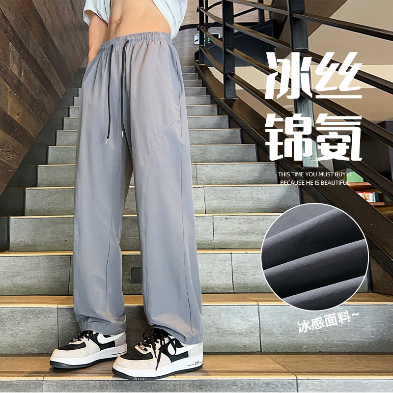 冰丝男裤夏季薄款潮牌男装拖地直筒男士休闲裤宽松简约百搭裤子男