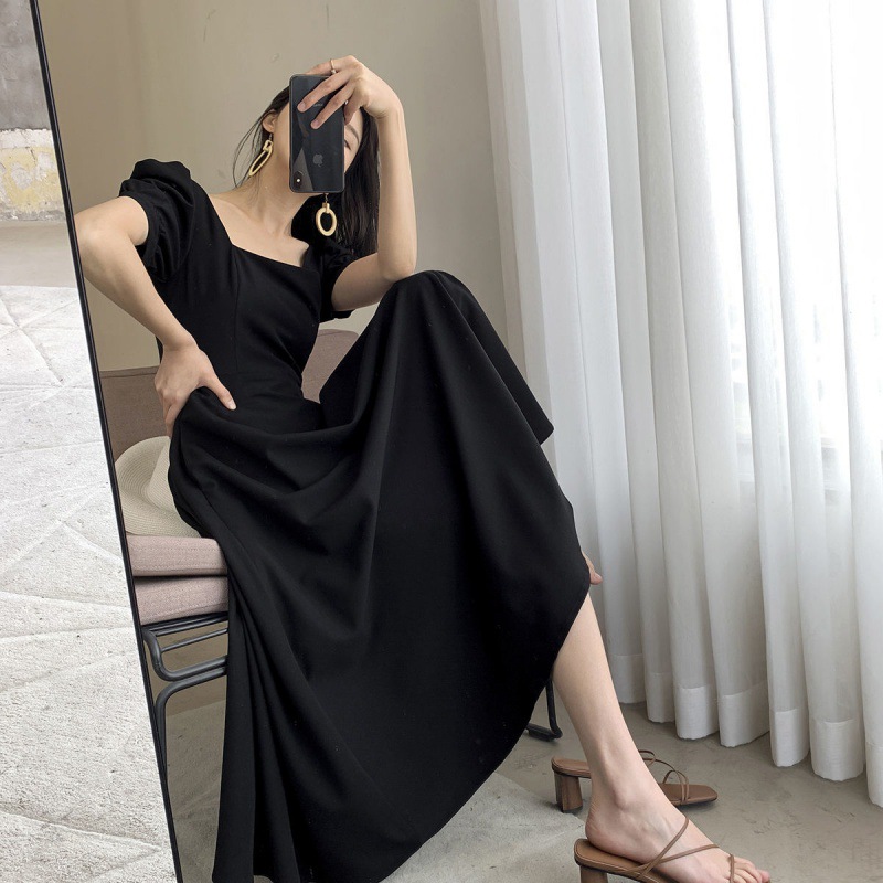 黑色连衣裙女夏新款ins茶歇裙气质方领过膝长款赫本风小黑裙