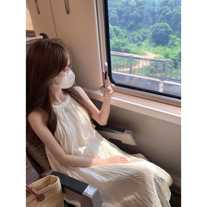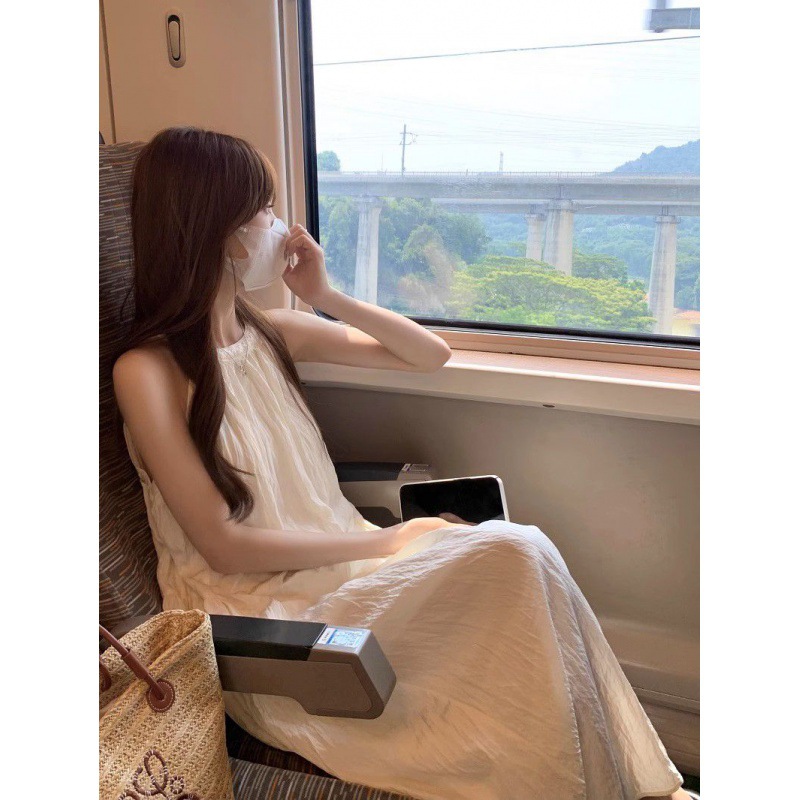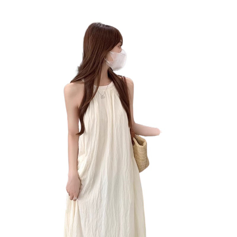 甜美挂脖连衣裙仙女夏季新款白色裙子无袖气质A字长裙女