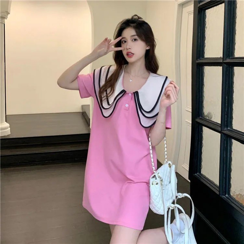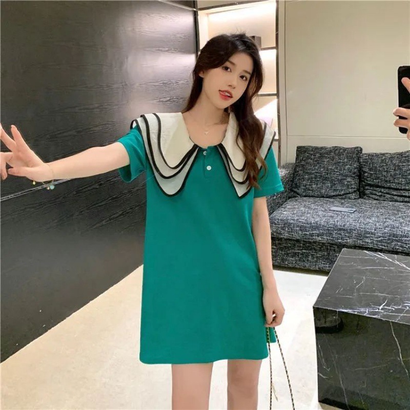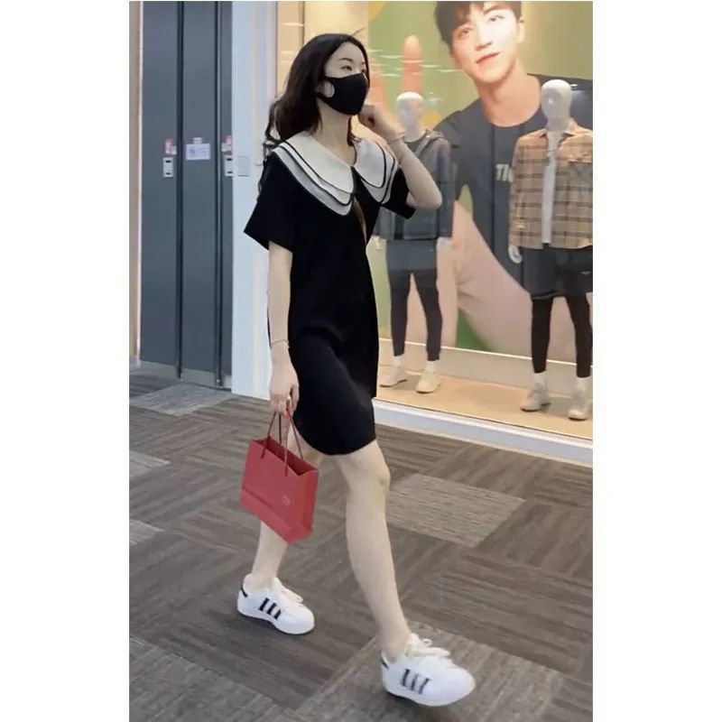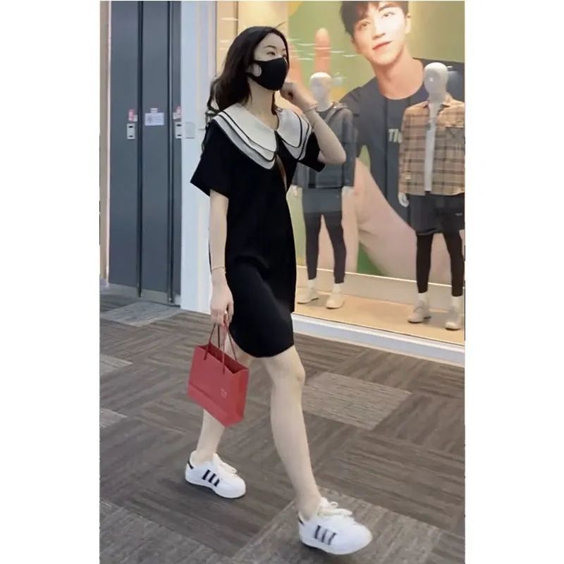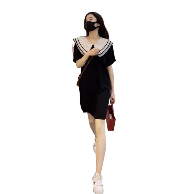 短袖减龄娃娃领连衣裙女夏季新款韩版宽松显瘦气质中长小黑裙