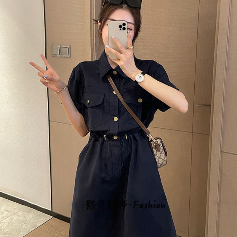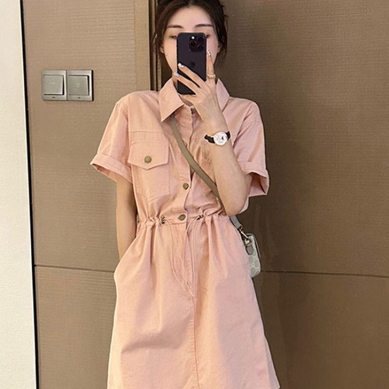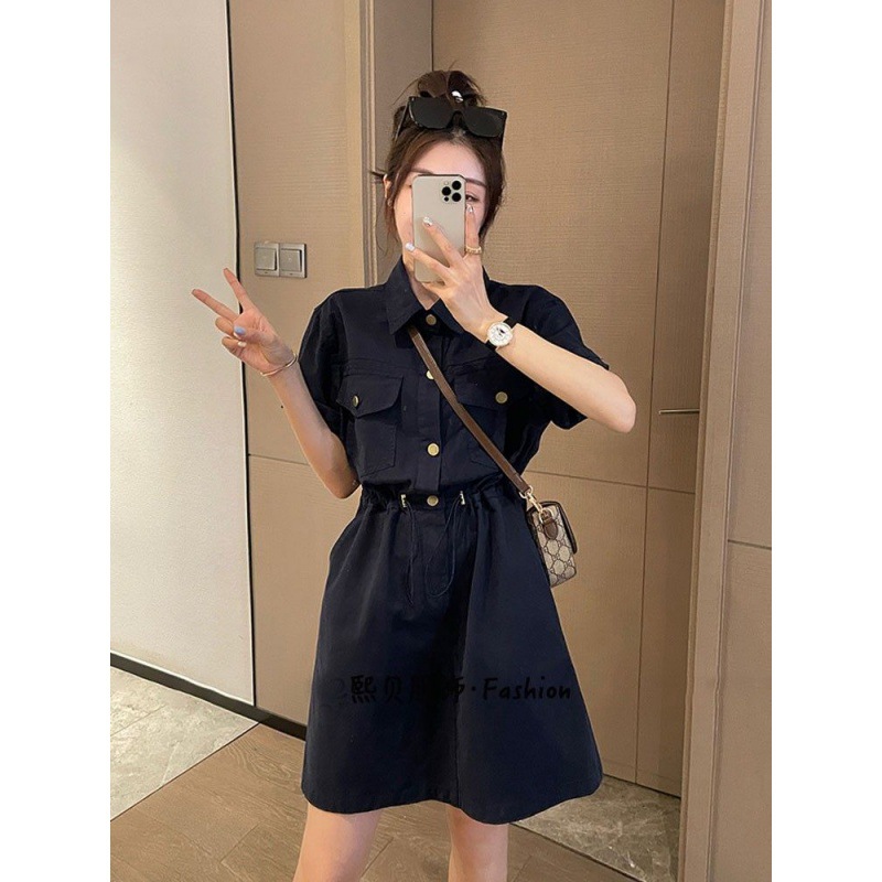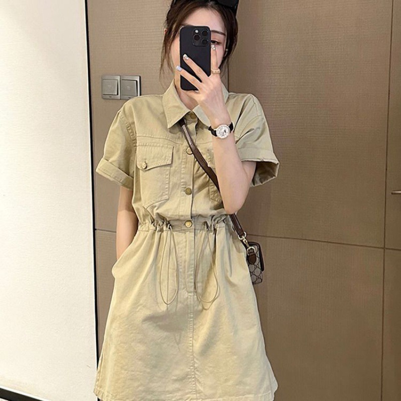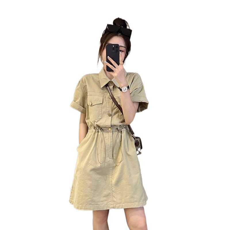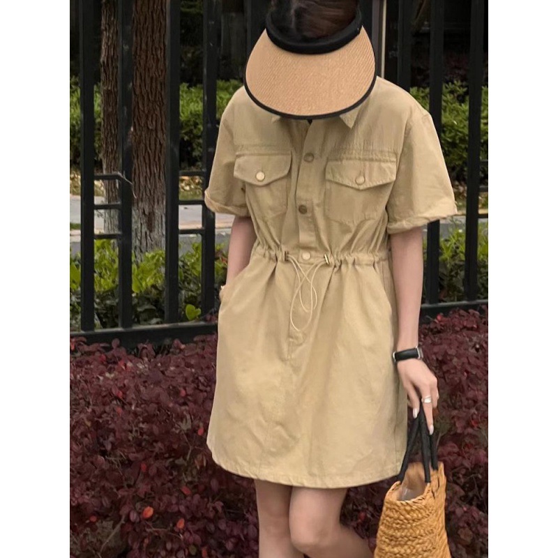 欧货设计感抽绳收腰工装连衣裙女夏季新款韩版宽松百搭A字裙