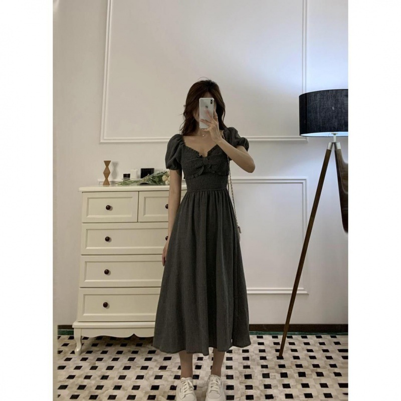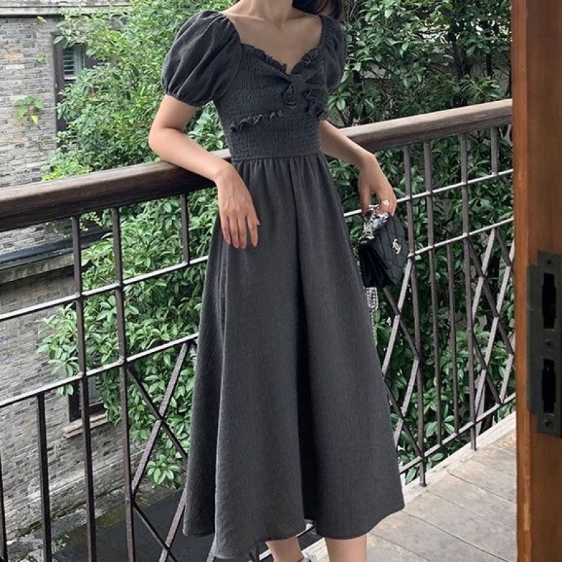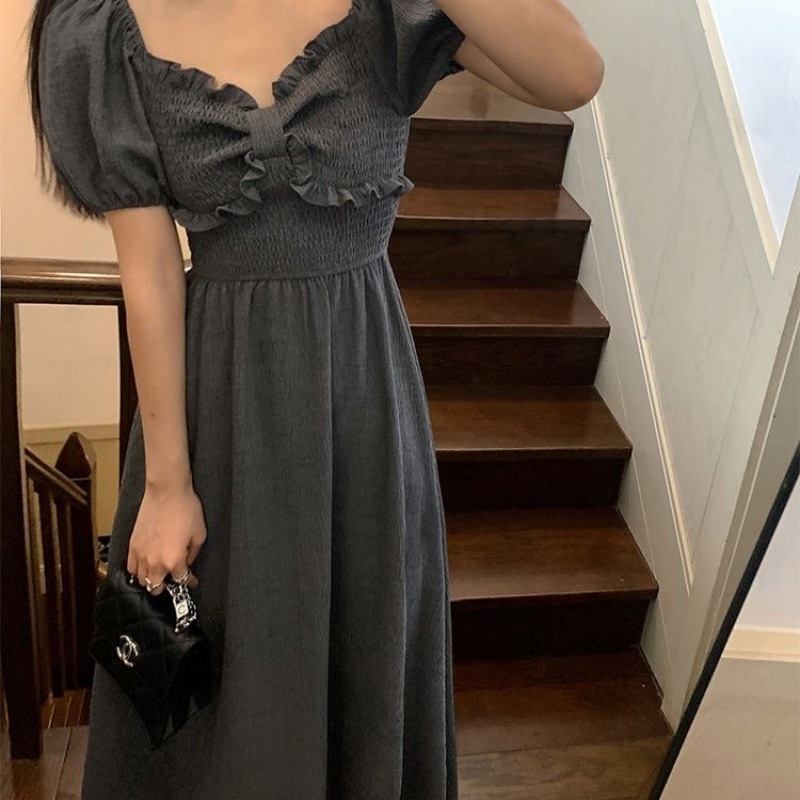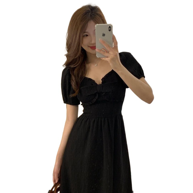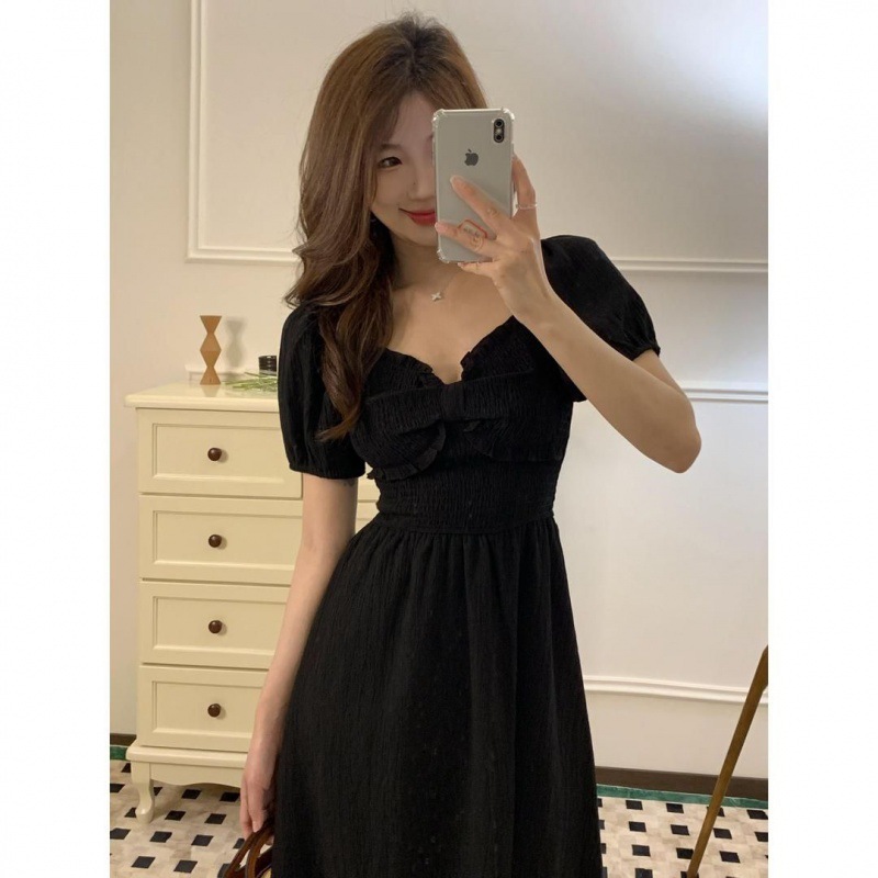 黑色方领连衣裙夏季女新款法式褶皱小众设计感心机收腰裙子女