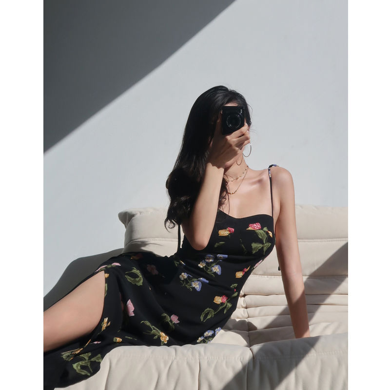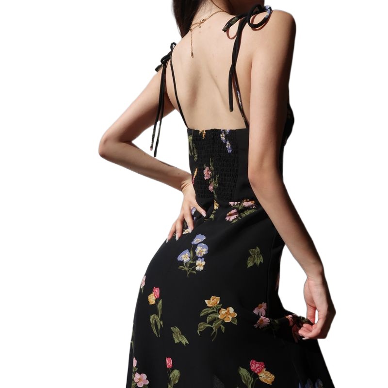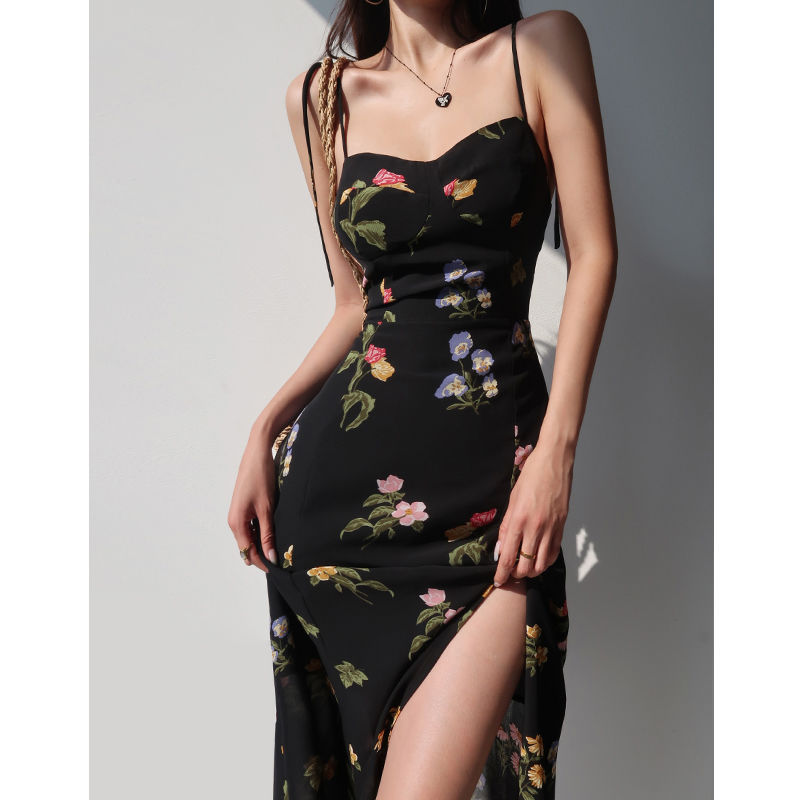 法式黑色印花高腰吊带裙复古性感收腰显瘦侧开叉系带连衣裙长裙女