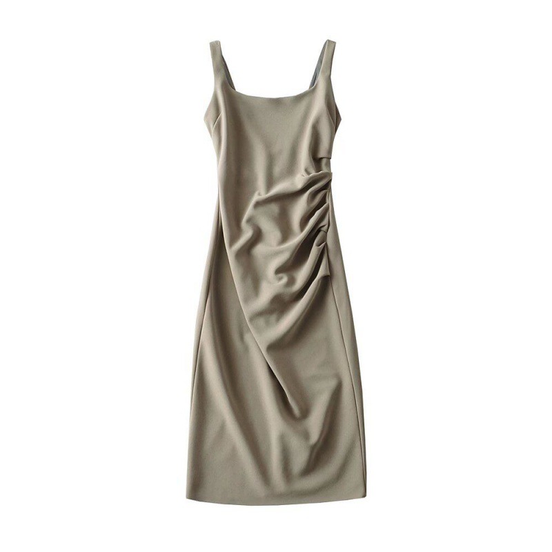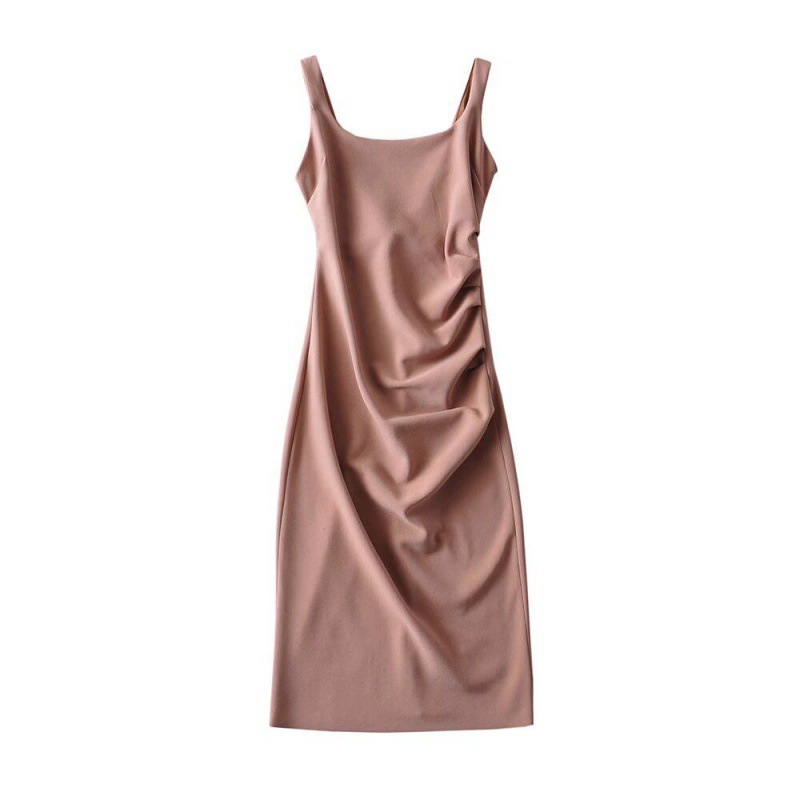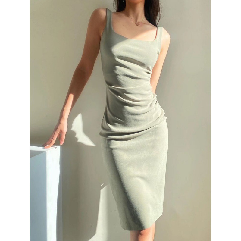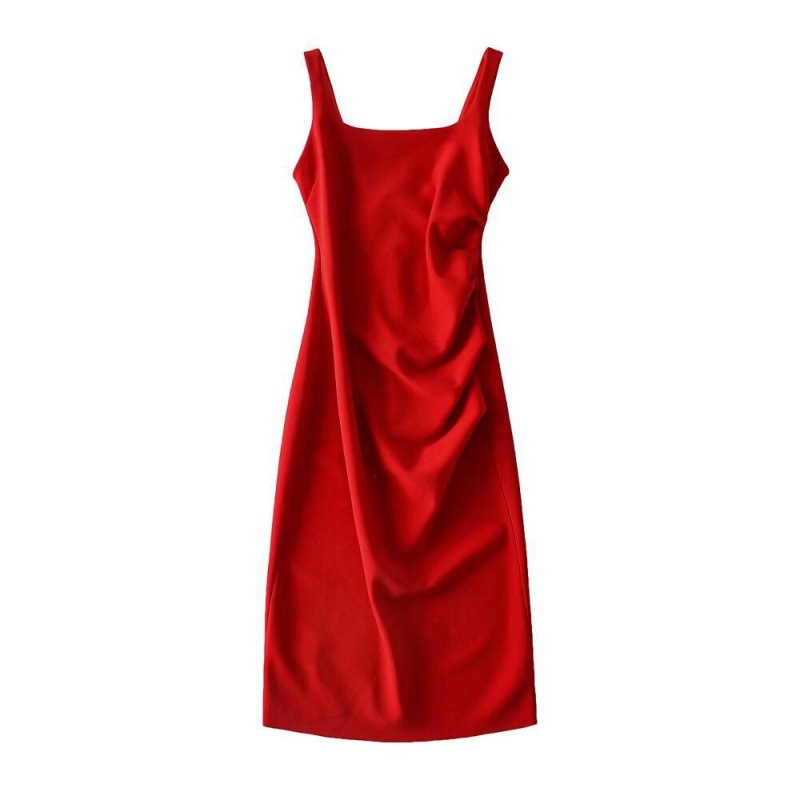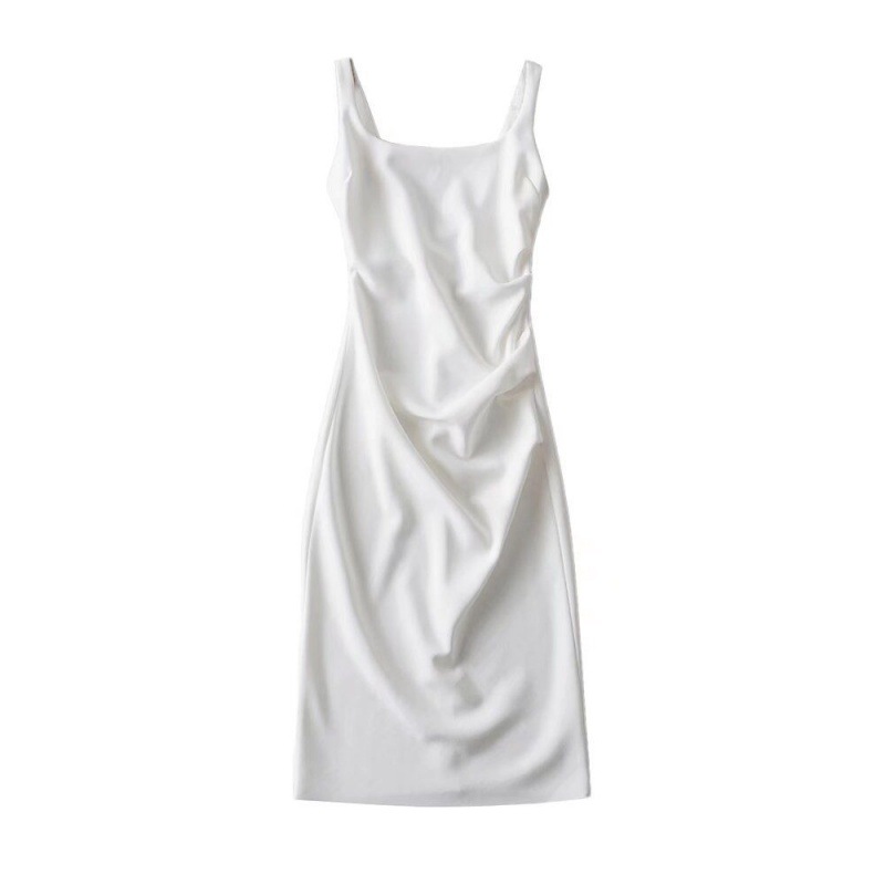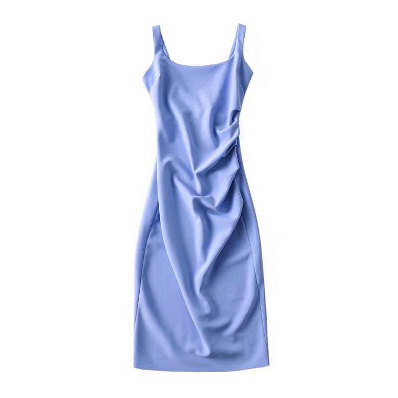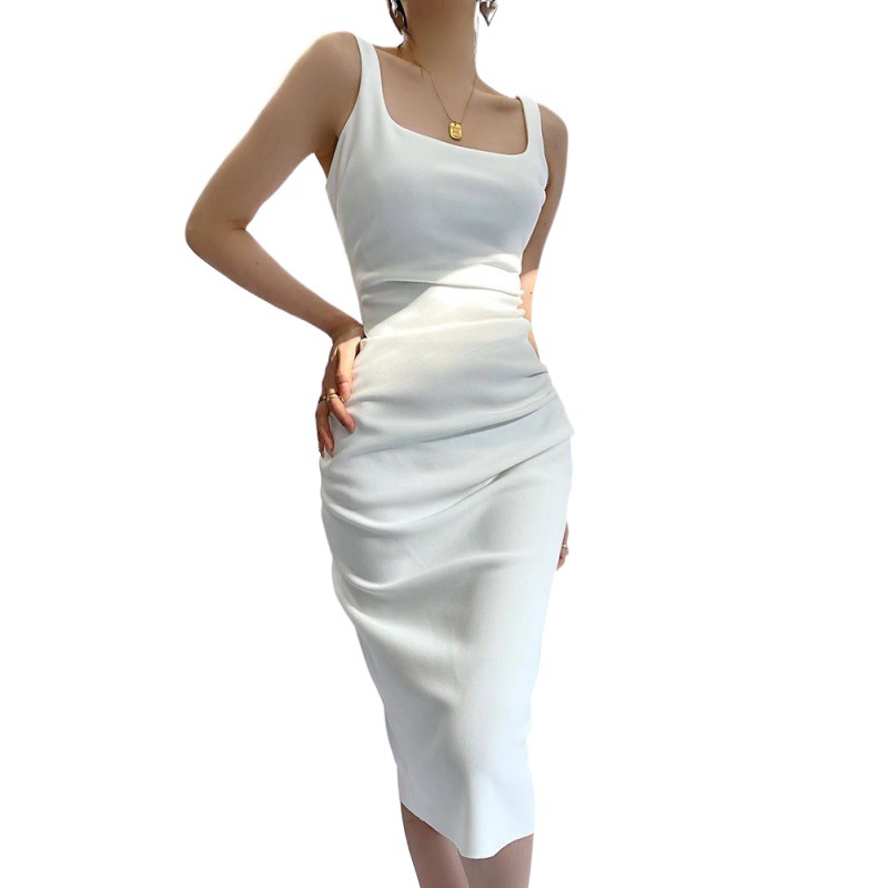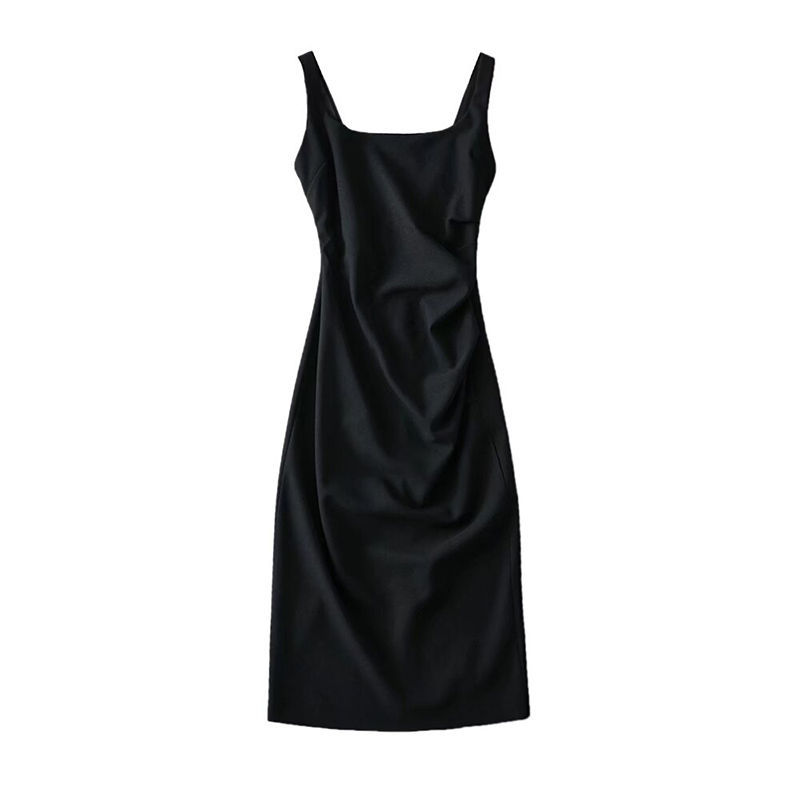 法式纯色U领弹力修身显瘦吊带连衣裙褶皱收腰背心长裙气质ins