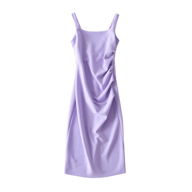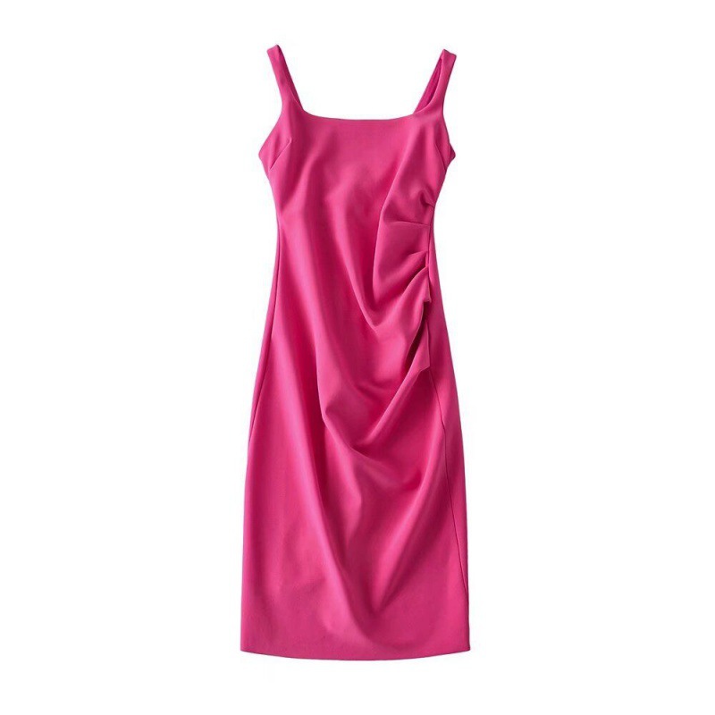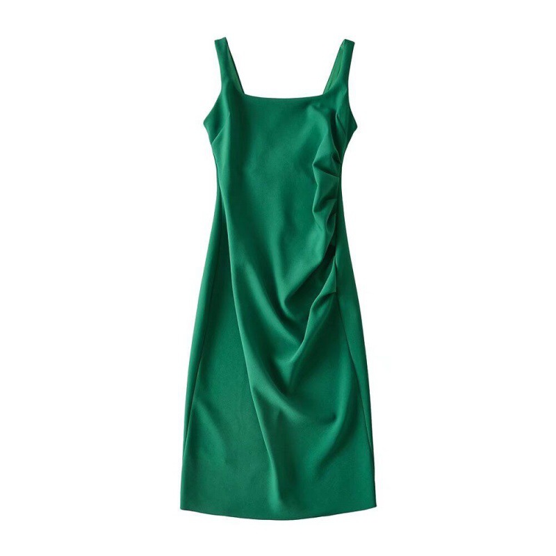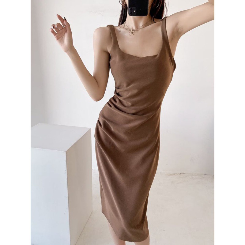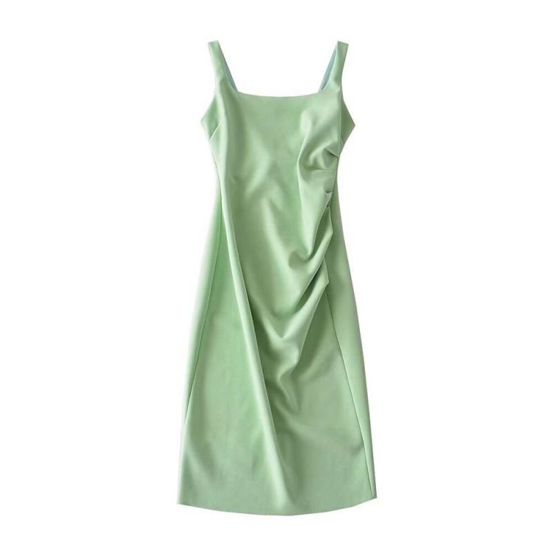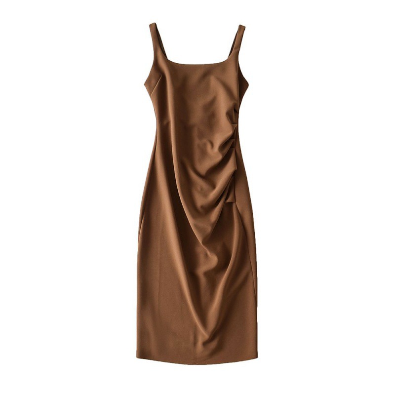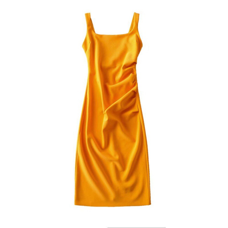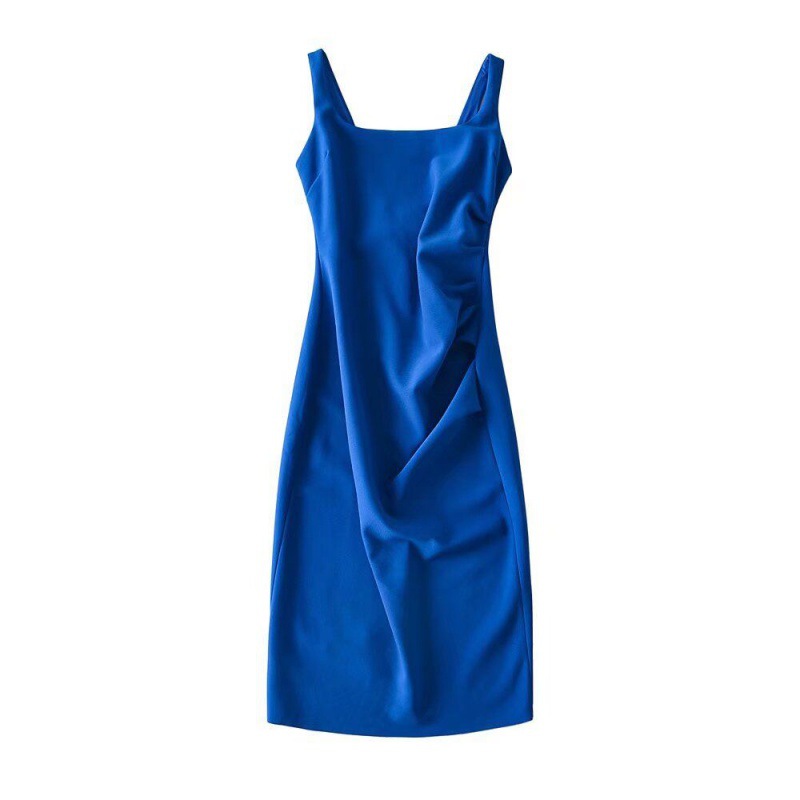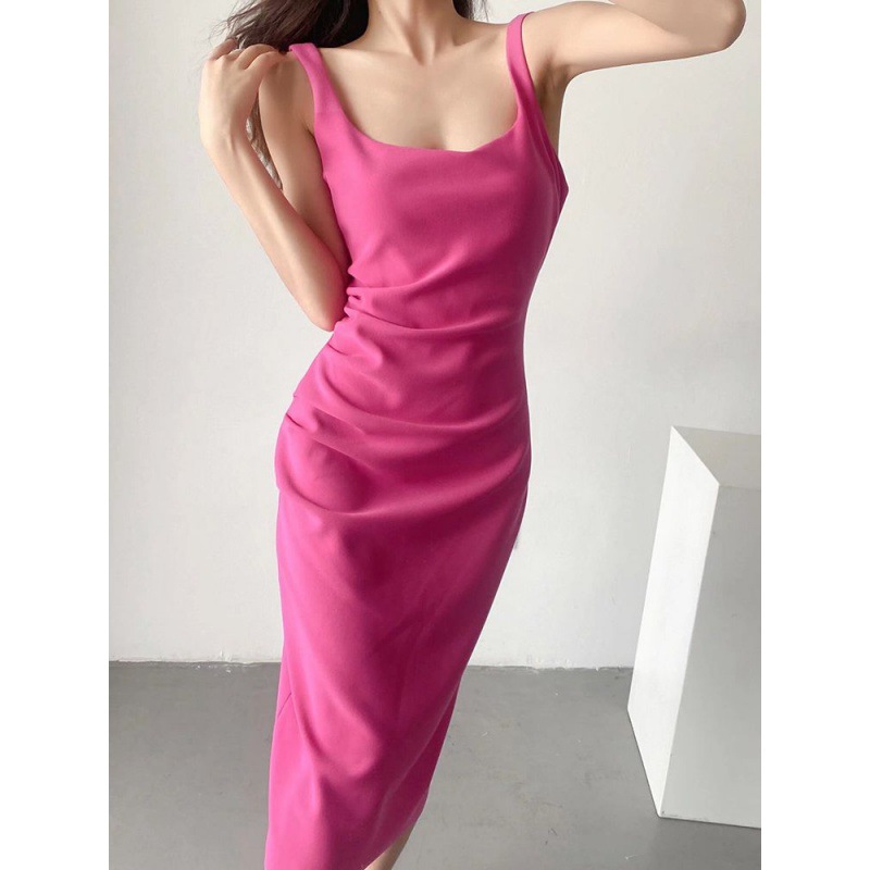 法式纯色U领弹力修身显瘦吊带连衣裙褶皱收腰背心长裙气质ins