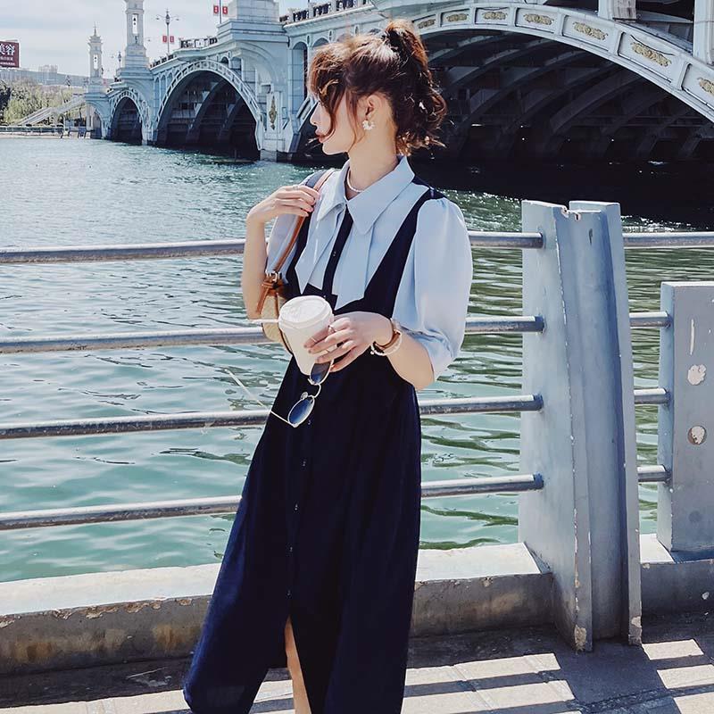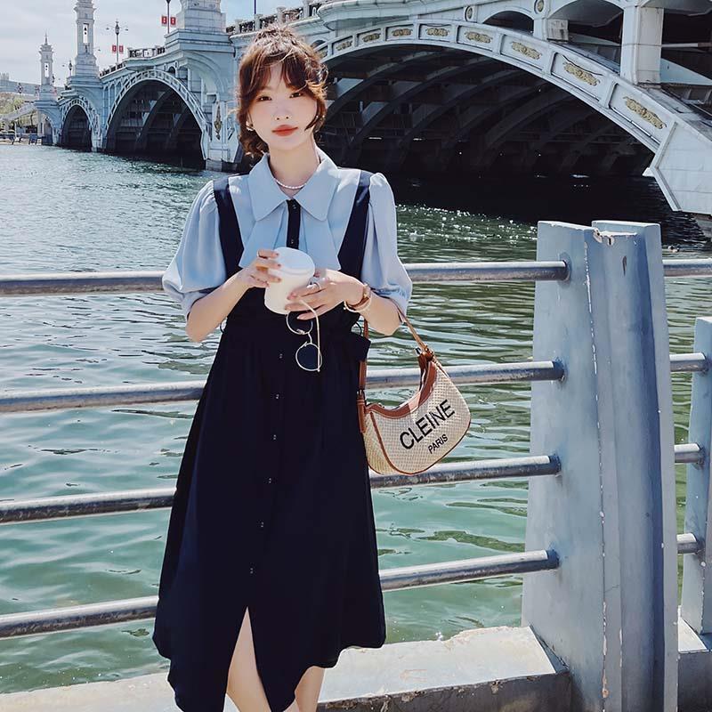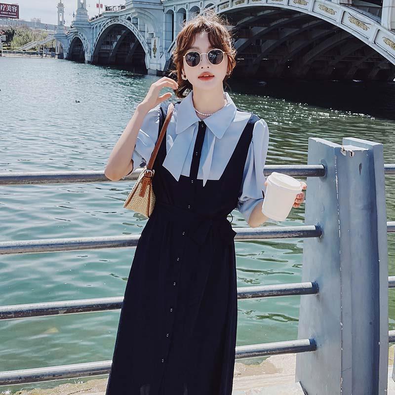 法式感连衣裙女夏新款韩系设计气质显瘦拼接小个子衬衫裙