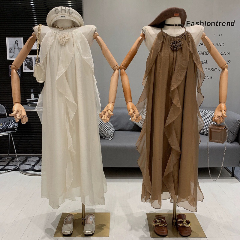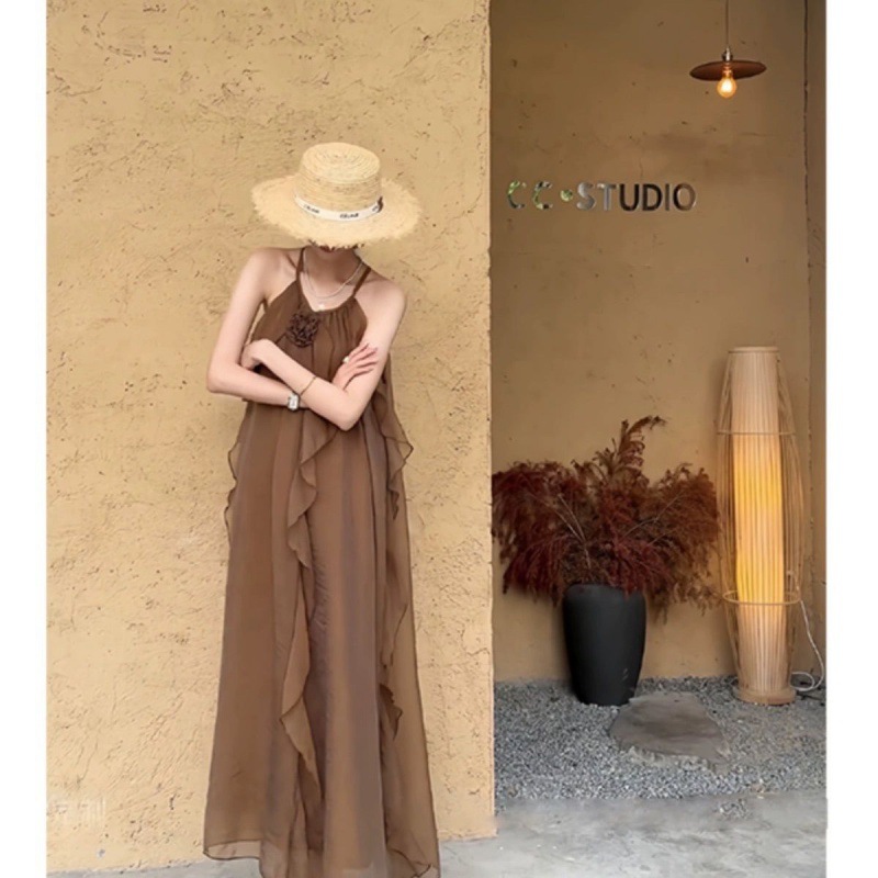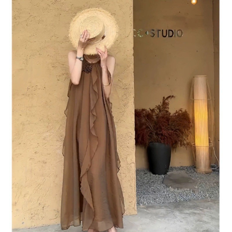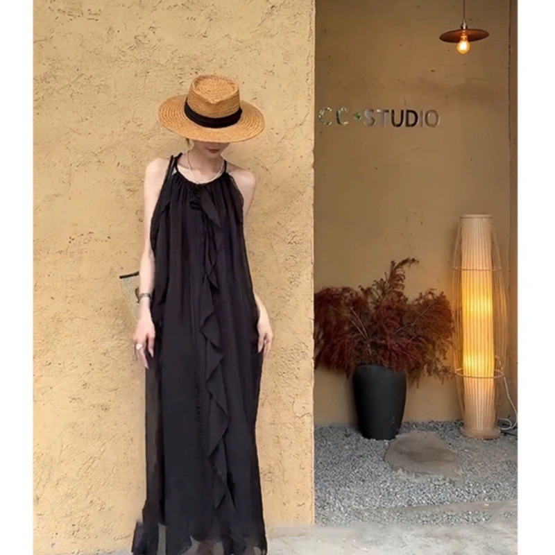 挂脖吊带连衣裙夏季新款夏装灰色气质感海边长款裙子大码