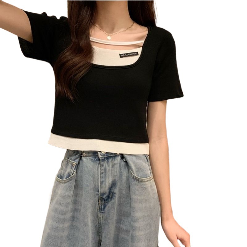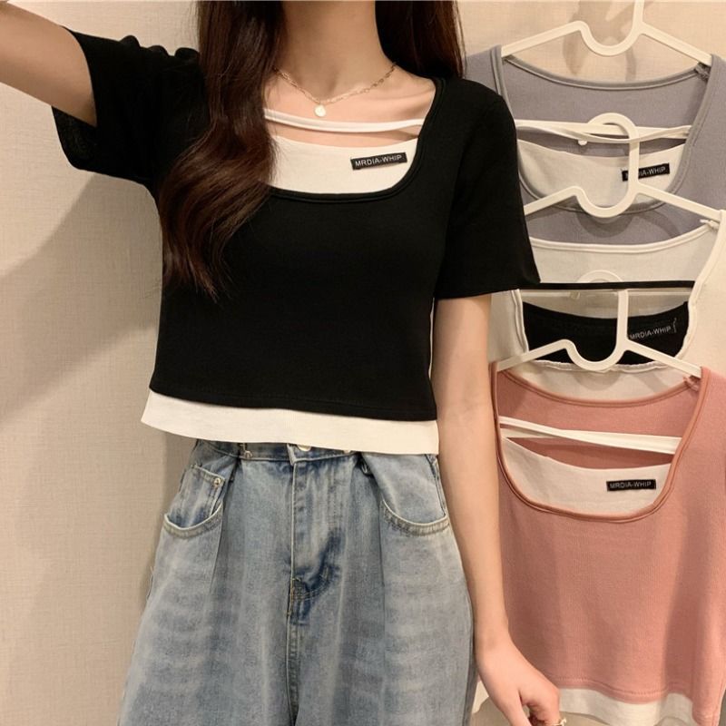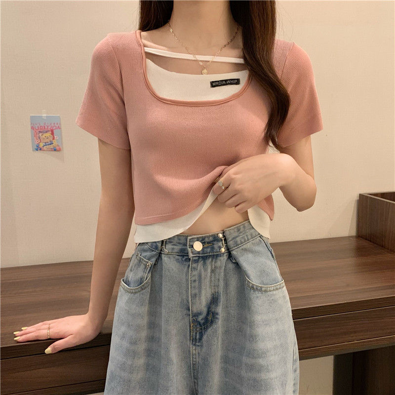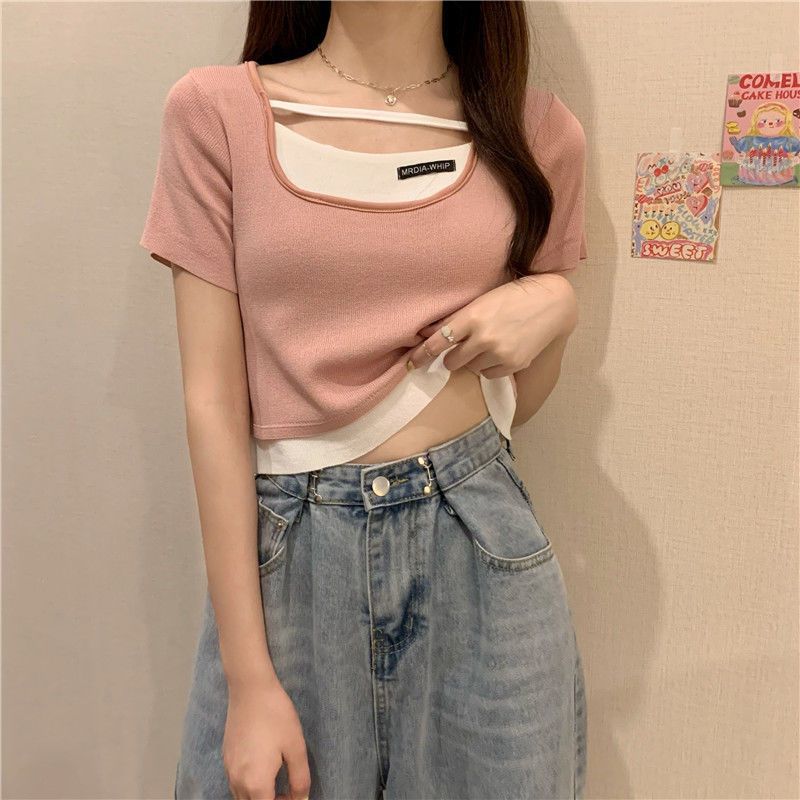 假两件方领粉色T恤女夏季新款设计感小众短袖短款辣妹上衣潮