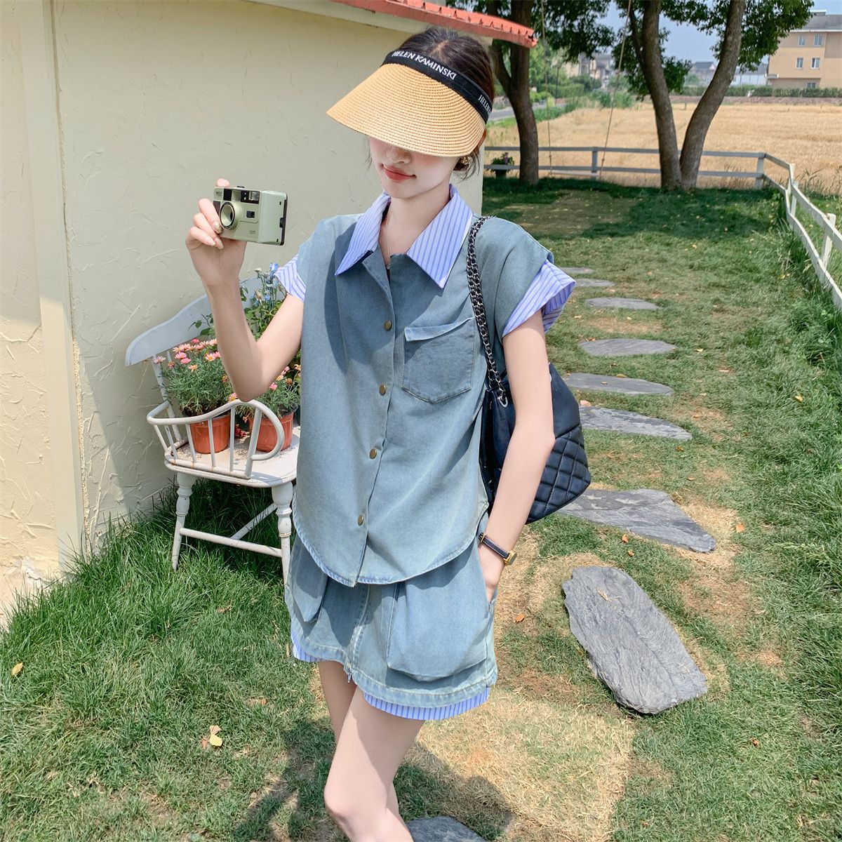盐系假两件牛仔拼接衬衫短裤套装两件套女夏季时尚洋气减龄小个子