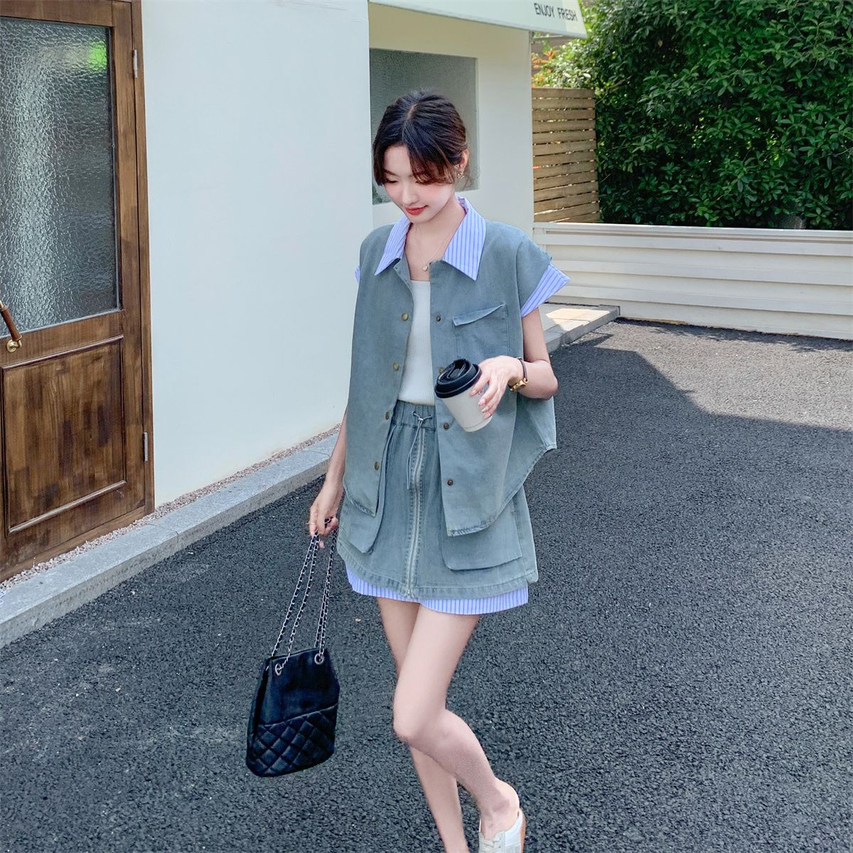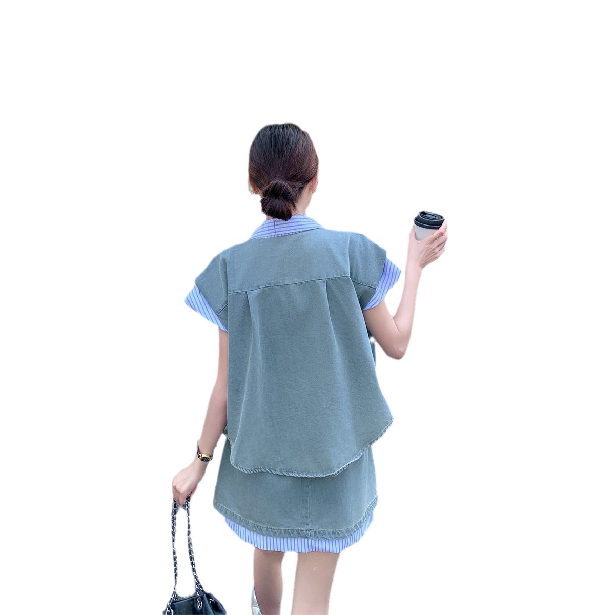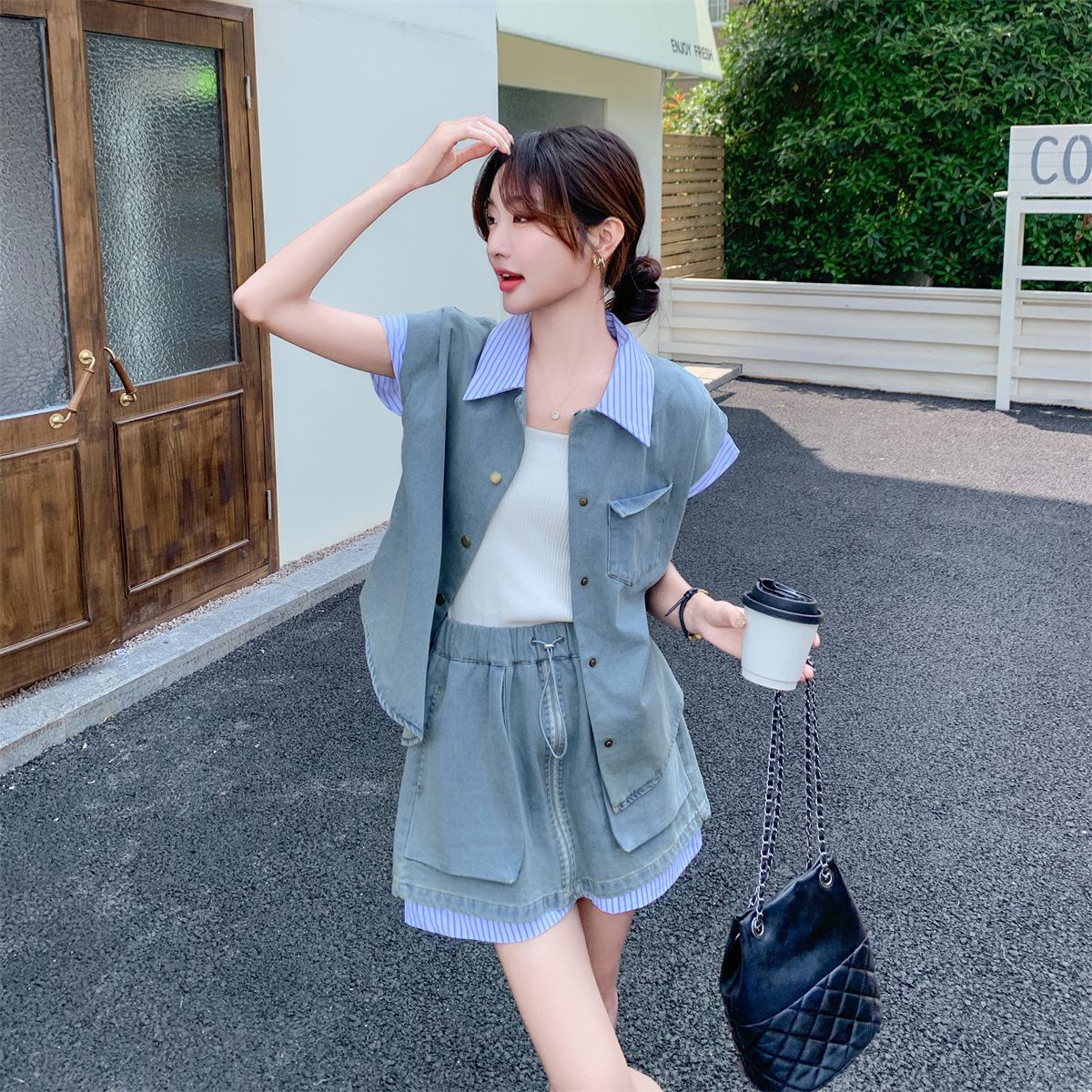 牛仔拼接衬衫短裤套装