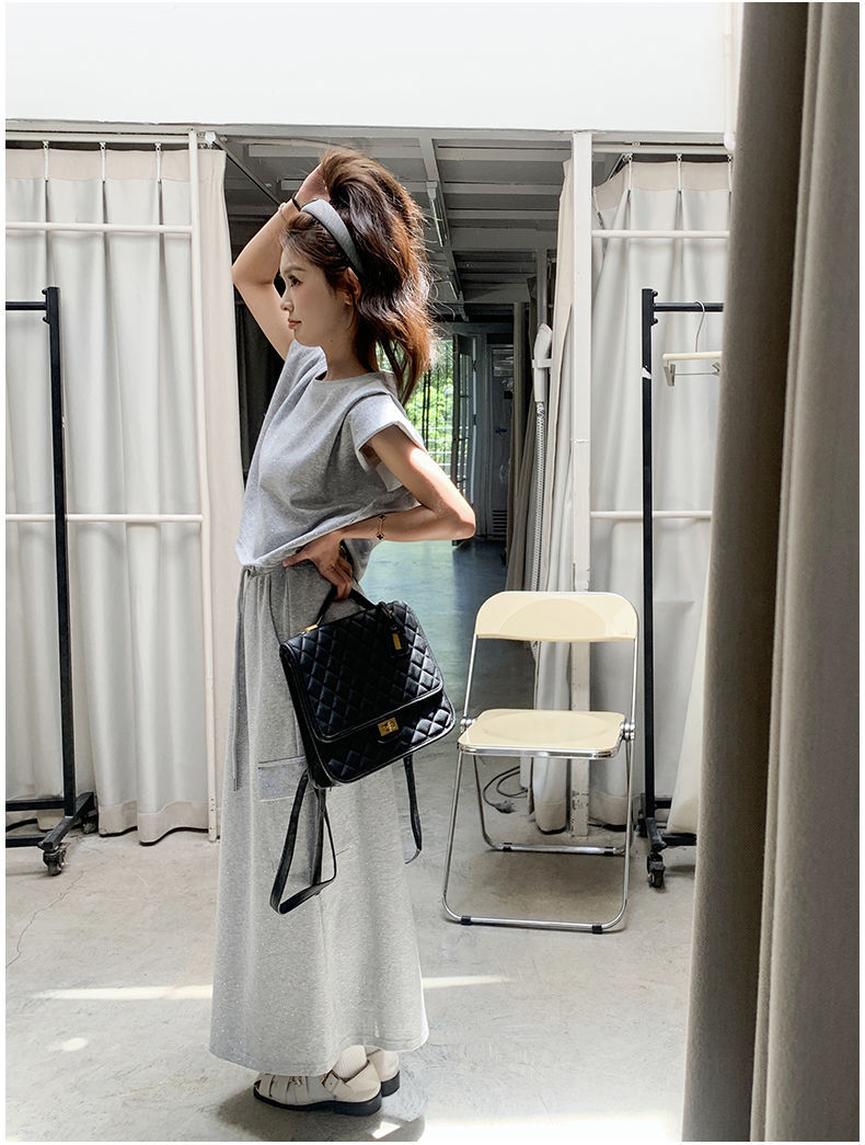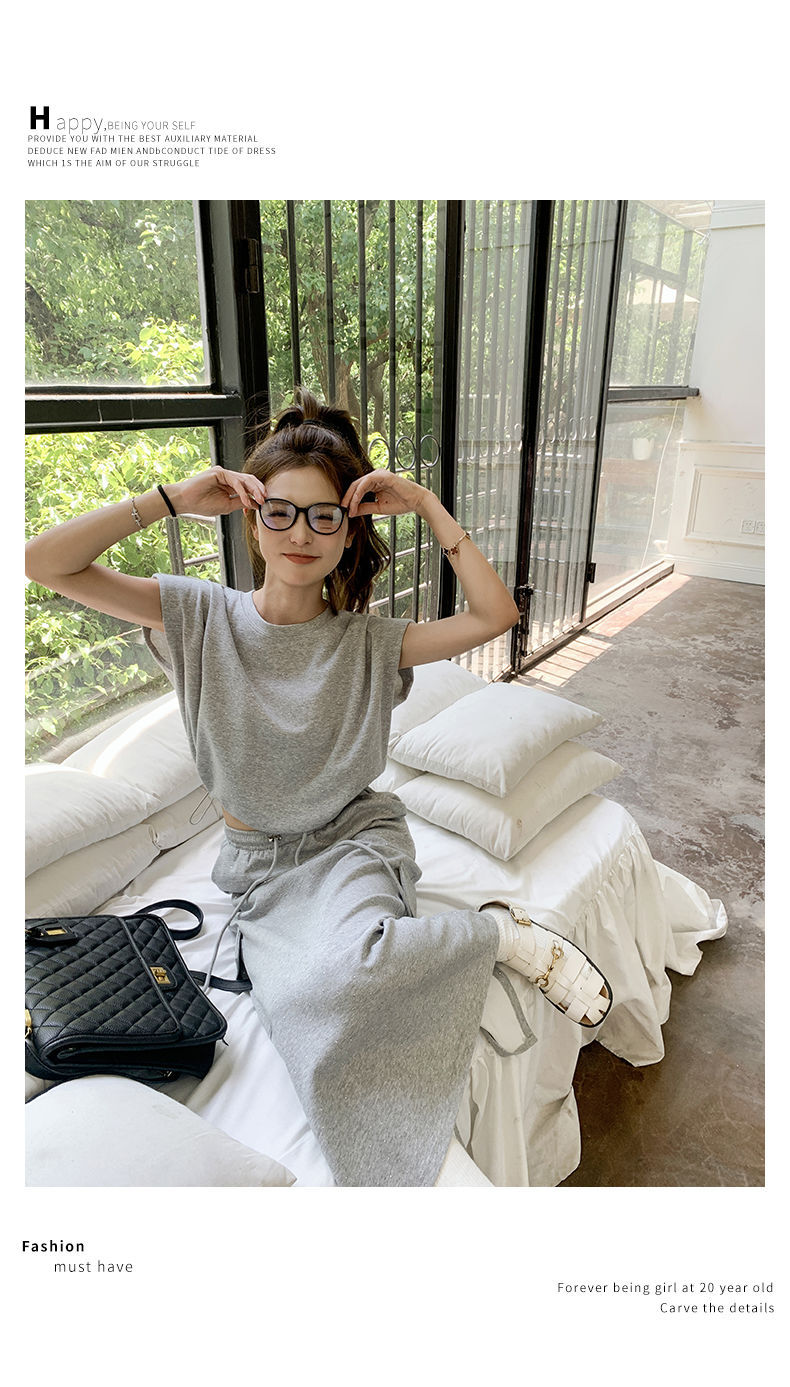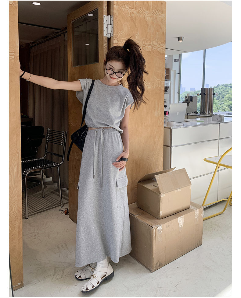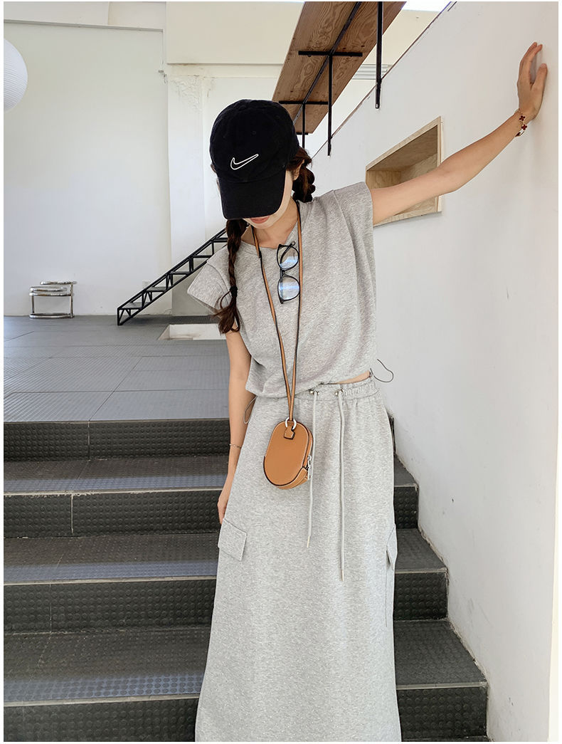 灰色休闲运动套装裙女夏新款可盐可甜飞飞袖T恤半身裙两件套