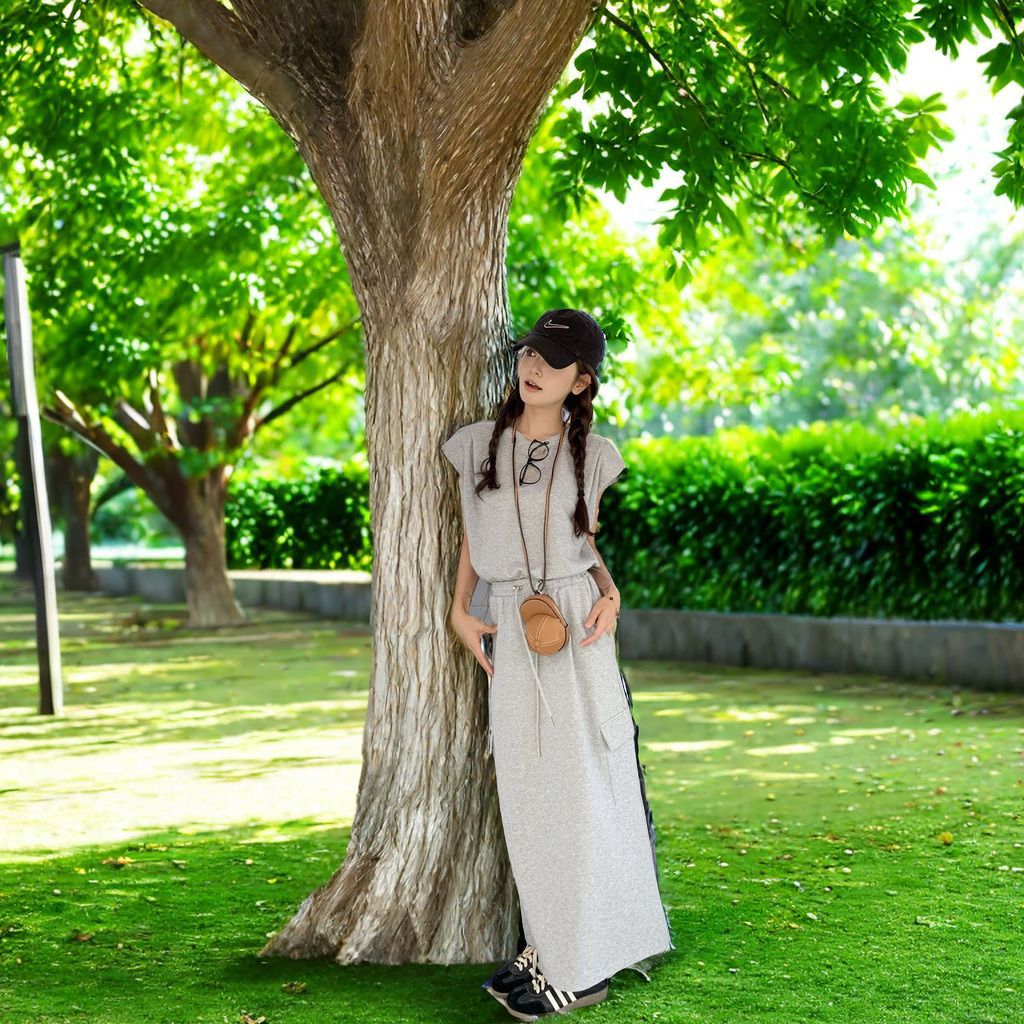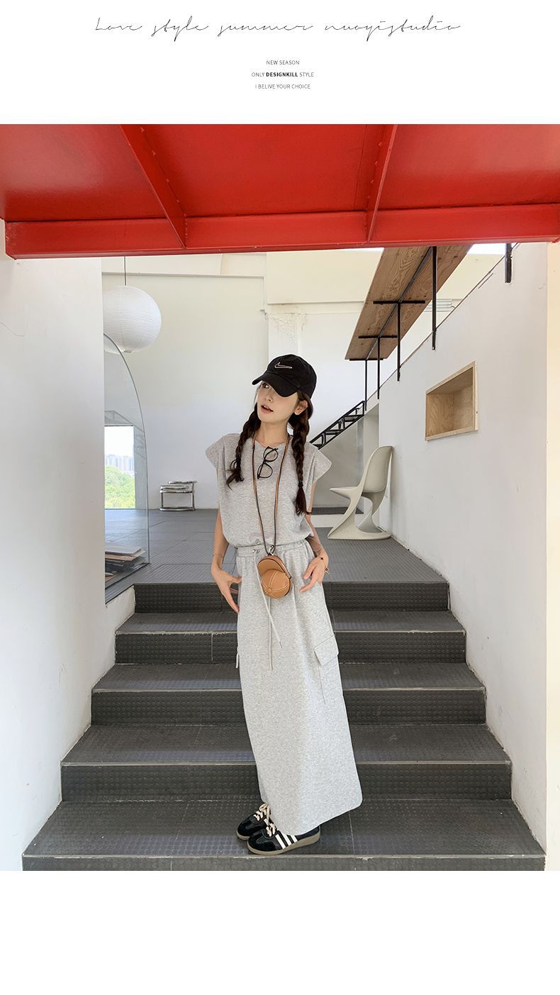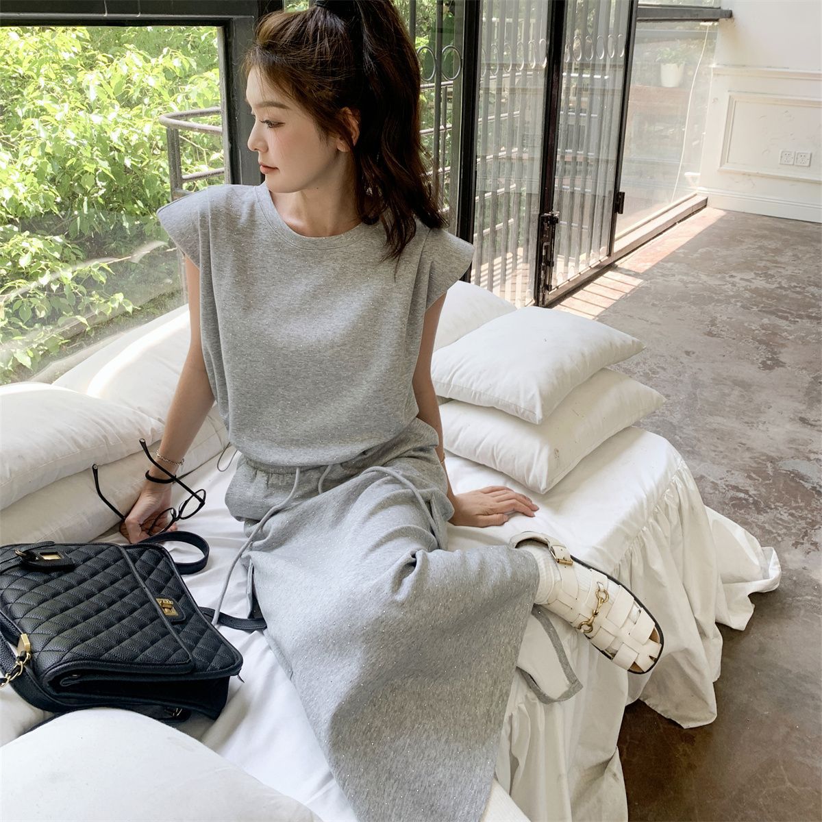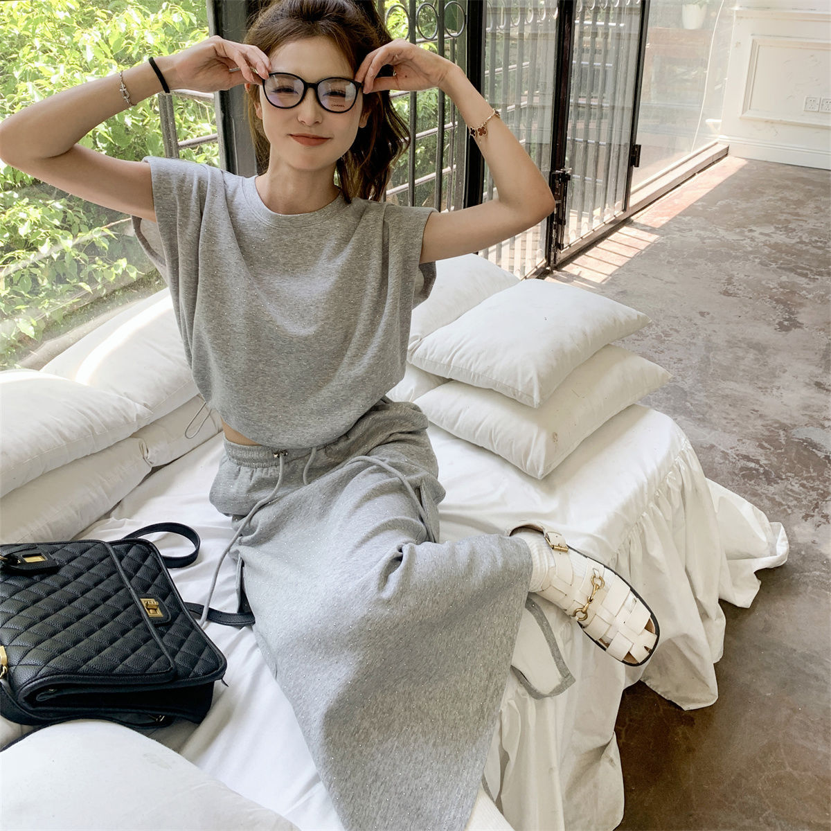 灰色休闲运动套装裙女夏新款可盐可甜飞飞袖T恤半身裙两件套