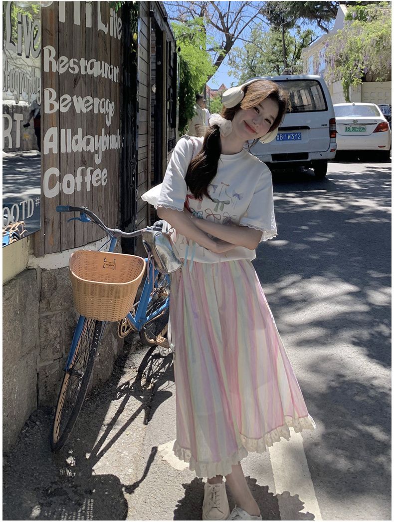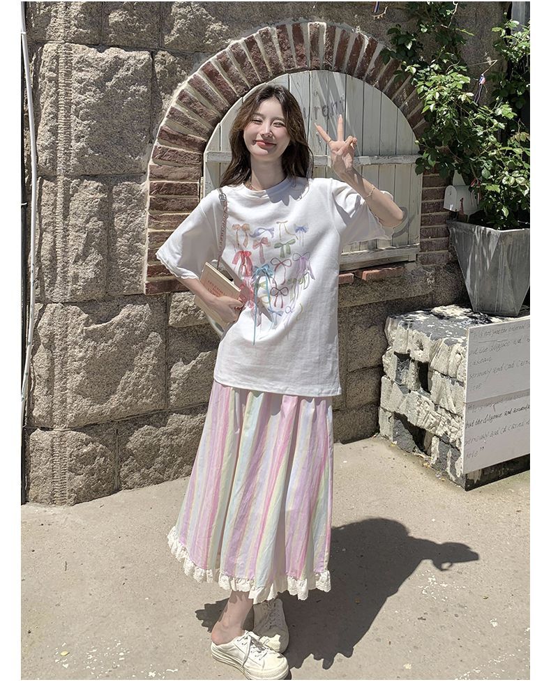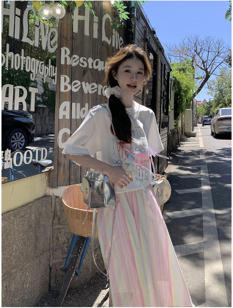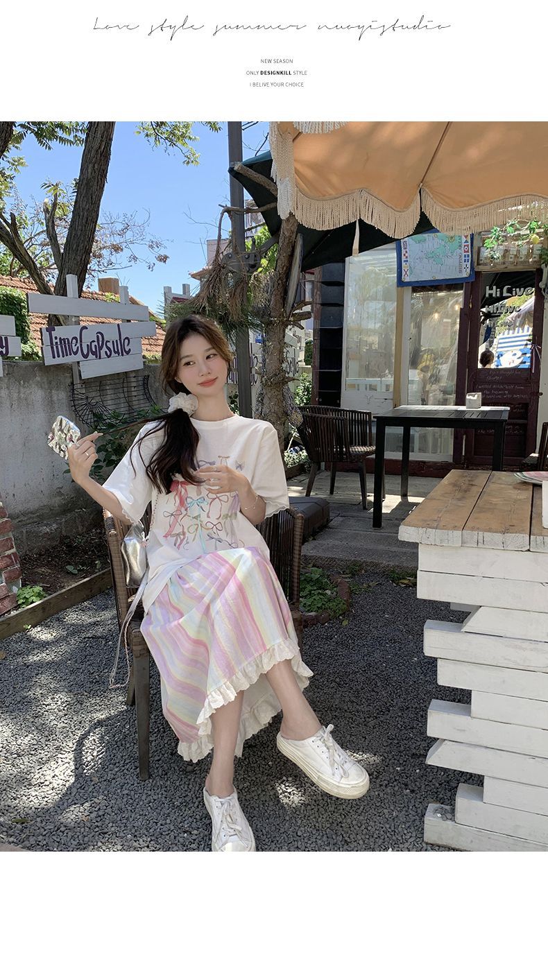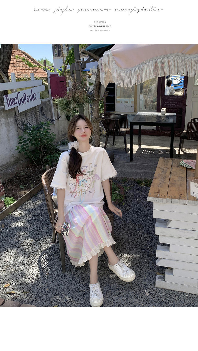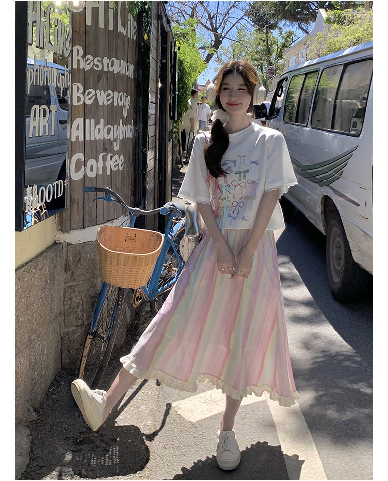 甜美多巴胺套装裙女夏新款印花T恤上衣彩色条纹半身裙两件套