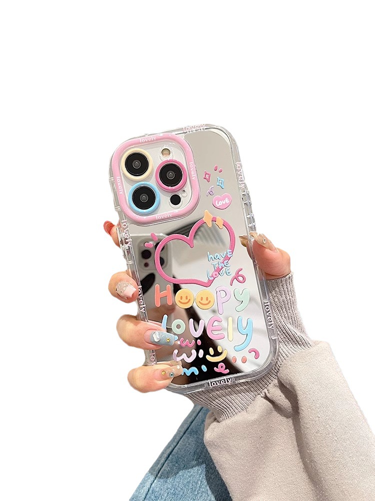 适用苹果15手机壳爱心涂鸦镜子iPhone14promax防摔12软11网红女13