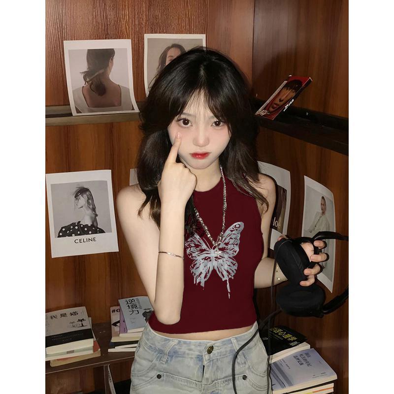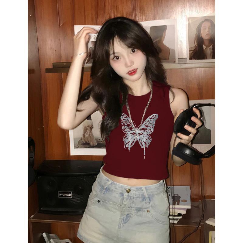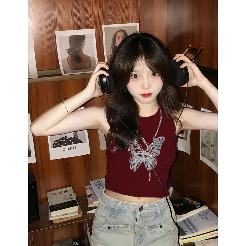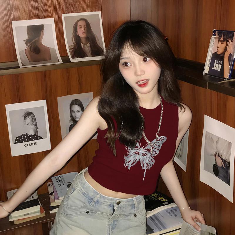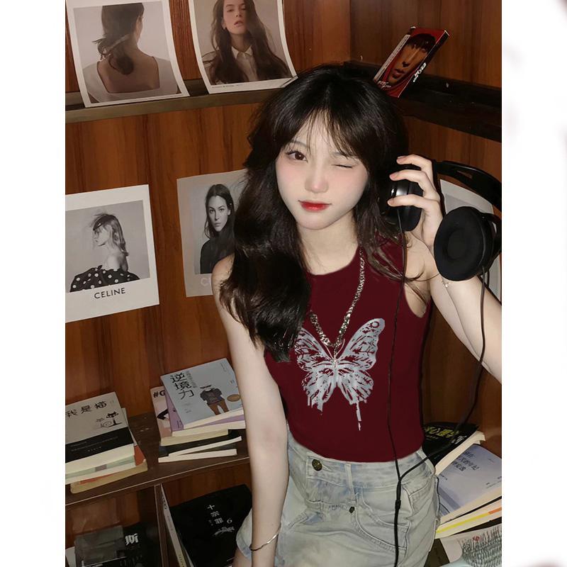 夏日多巴胺穿搭无袖t恤女酒红色美式复古短款辣妹修身显瘦小背心
