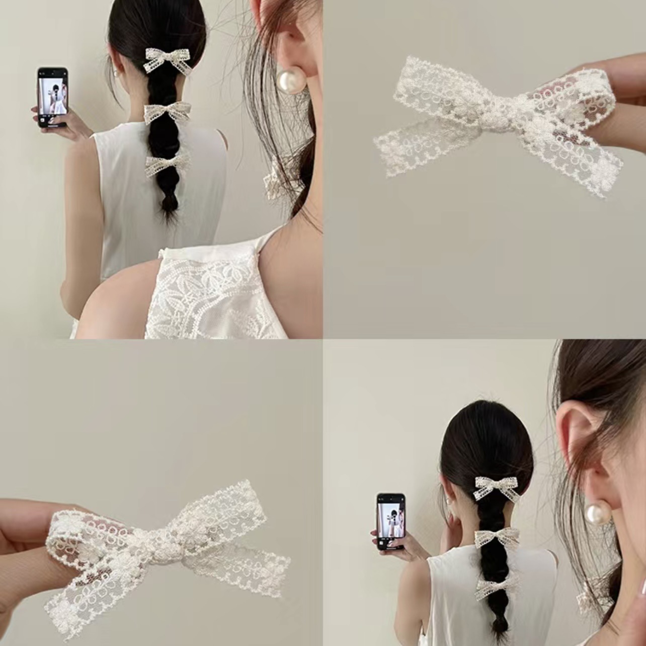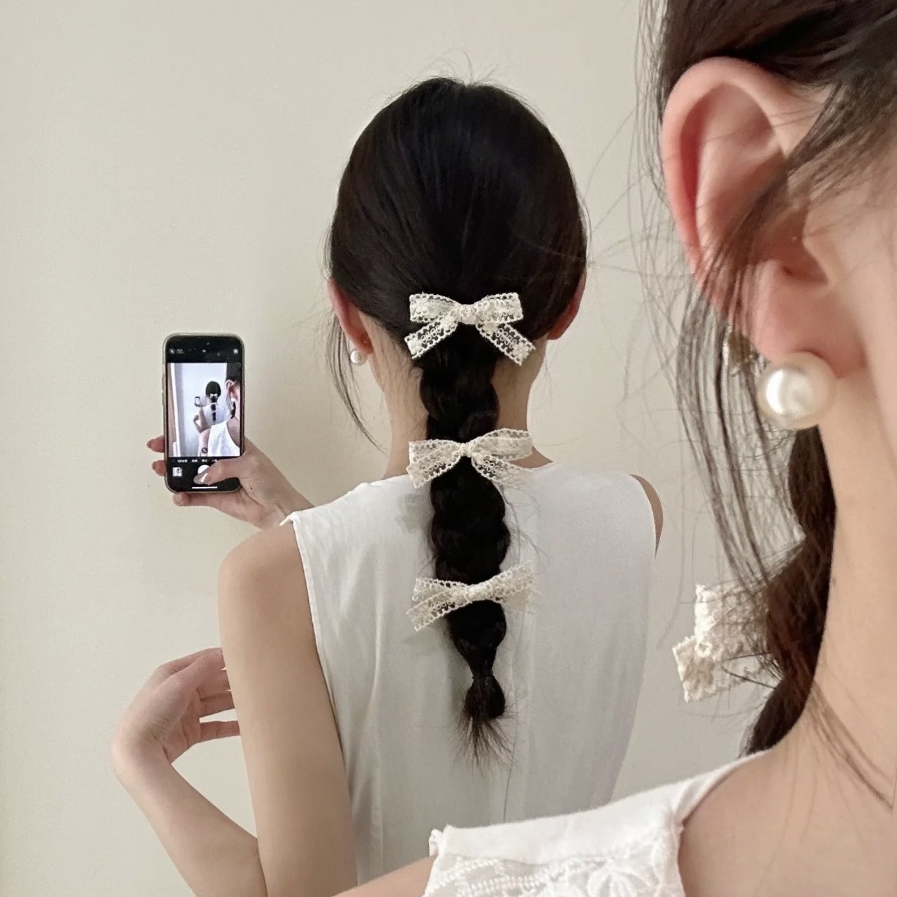 少女蕾丝奶白色蝴蝶结发夹温柔甜美低马尾鸭嘴夹侧边刘海夹发饰女